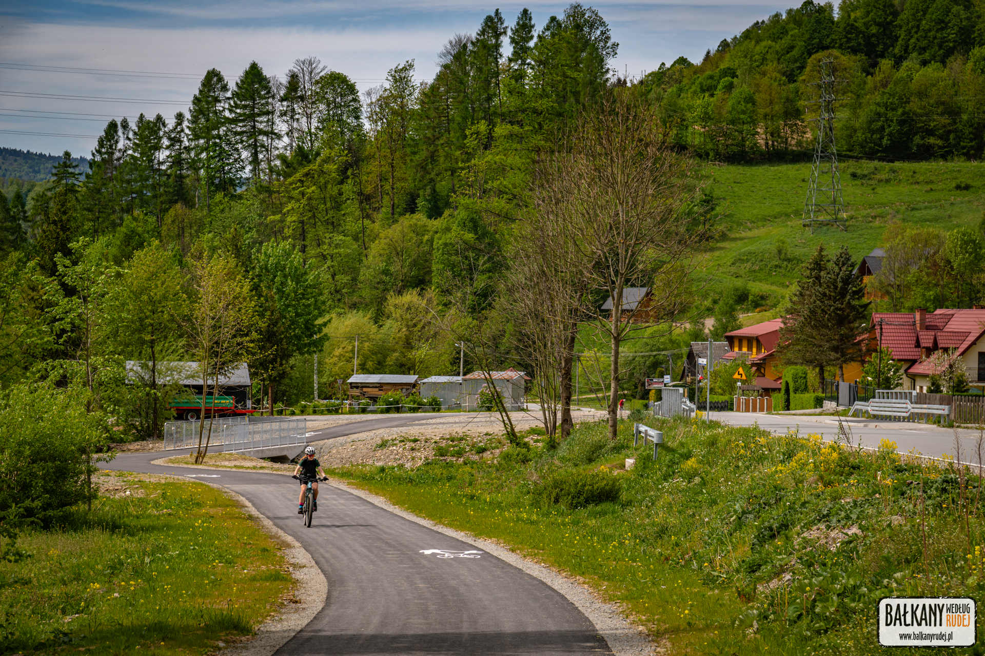 Przy schronisku na chwilę się rozdzieliliśmy. Na dół Marek postanowił zjechać żółtym szlakiem oraz bardzo polecaną trasą „Salamandra”. Ja natomiast obrałam asfaltową drogę. Spotkaliśmy się ponownie w Skrudzinie, skąd szlakiem rowerowym udaliśmy się do Barcic. Tam wjechaliśmy na trasę wzdłuż Popradu, która przeprowadziła nas bezpośrednio do Piwnicznej-Zdrój. Po drodze zafundowała nam jeden odcinek specjalny, który bardziej przypominał trasę enduro niż szlak rowerowy dla każdego. Ale nawet mnie (rudej) całkiem się podobał.