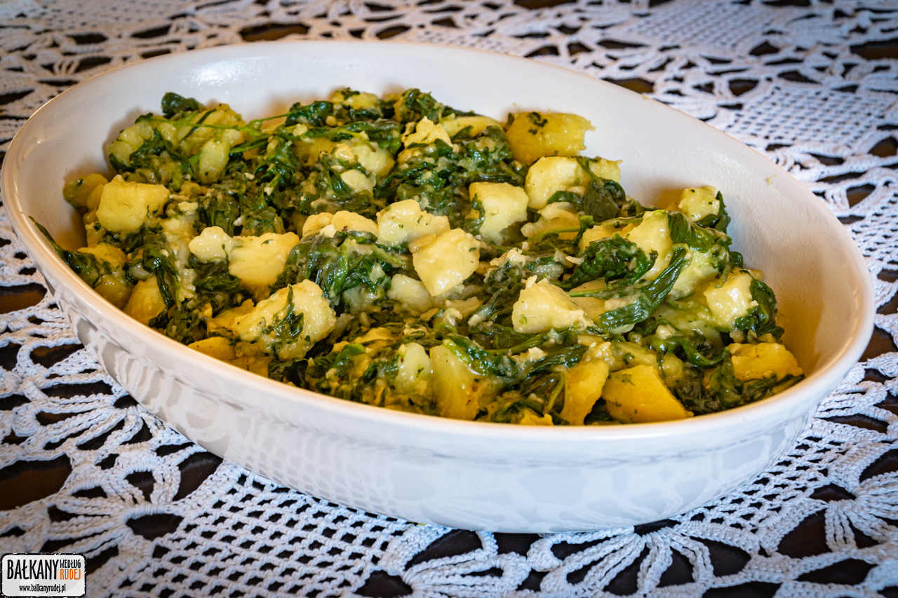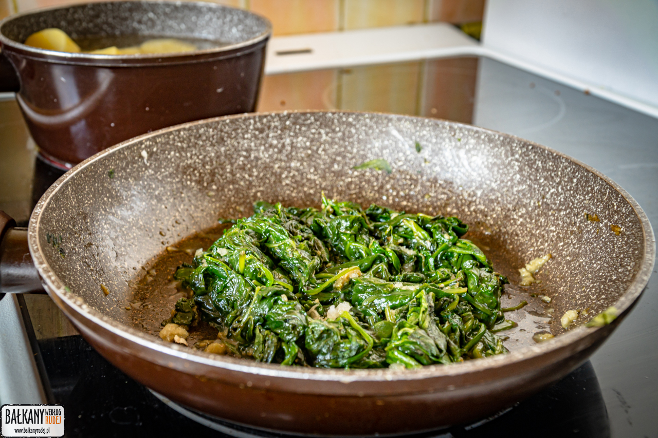 Ziemniaki obieramy ze skóry i podgotowujemy, by osiągnęły stan jeszcze nie miękkie, ale już nie twarde. Na dużej patelni podsmażamy na maśle czosnek i szpinak. Czekamy, aż liście zmiękną, a większość wody wyparuje. Następnie dodajemy kolejną porcję masła i czosnku, dorzucamy pokrojone w kostkę ziemniaki i dusimy razem wszystkie składniki na małym ogniu. Na koniec doprawiamy solą i pieprzem według uznania. Spanać powinien mieć lekko kremową konsystencję, ale z drugiej strony ziemniaki i szpinak powinny mieć nadal wyraźną strukturę.