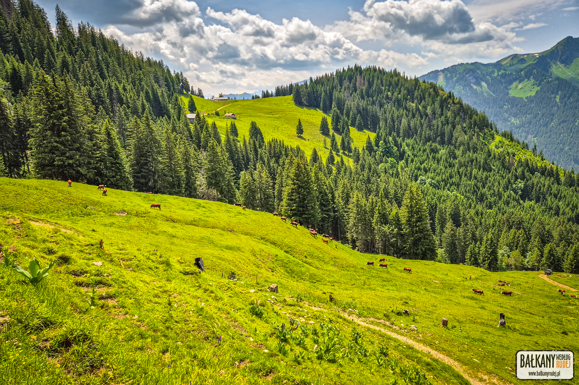 Trasę tę spokojnie możecie zrealizować w ramach wycieczki trekkingowej, dodatkowo ułatwiając sobie życie wjeżdżając na szczyt Morclan koleją gondolową Super Chatel, a następnie wyciągiem krzesełkowym. Ja zaczęłam bezpośrednio przy dolnej stacji gondoli, skąd szlakiem ruszyłam na górę. Trasa na Morclan wiedzie głównie szutrami i dość szybko pozwala podziwiać panoramę gór i Chatel. Po dotarciu na szczyt obrałam szlak biegnący wzdłuż granicy ze Szwajcarią, przez szczyt Pointe des Ombrieux. Na tym odcinku jest dość stromo, momentami musiałam wspomóc się rękami. Po zbiegnięciu z trawiastego grzbietu trzymałam się głównie szutrowych trawersów, które doprowadziły mnie do parkingu na Sevan Devant. Ta okolica była mi już dobrze znana z 2023 roku. To właśnie stamtąd dojść można do uroczego jeziorka – Lac d’Arvouin. Oczywiście zajrzałam nad nie. Znad jeziora zaczynam powrót do Chatel. Wybrałam inną trasę, by nieco sobie urozmaicić wycieczkę. Przebiegłam m.in. przez Col du Saix oraz niewielkie przysiółki rozsiane po górskich zboczach. Do tego mijałam liczne stada krów i rozkoszowałam się pięknem widoków. Po pokonaniu 24 km, w czasie ok. 4 godzin, dotarłam do Chatel.
