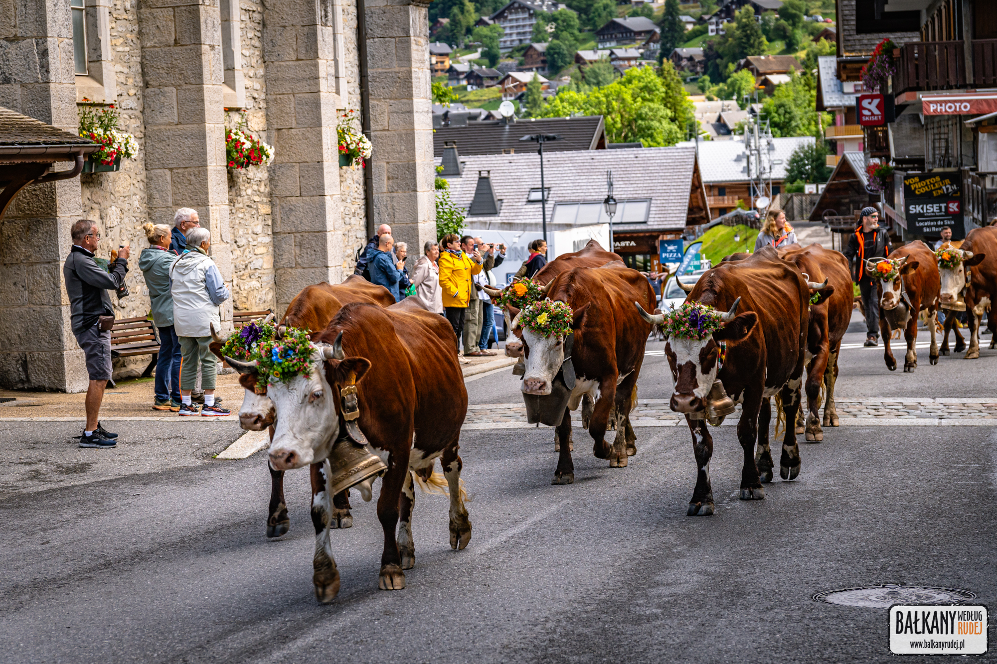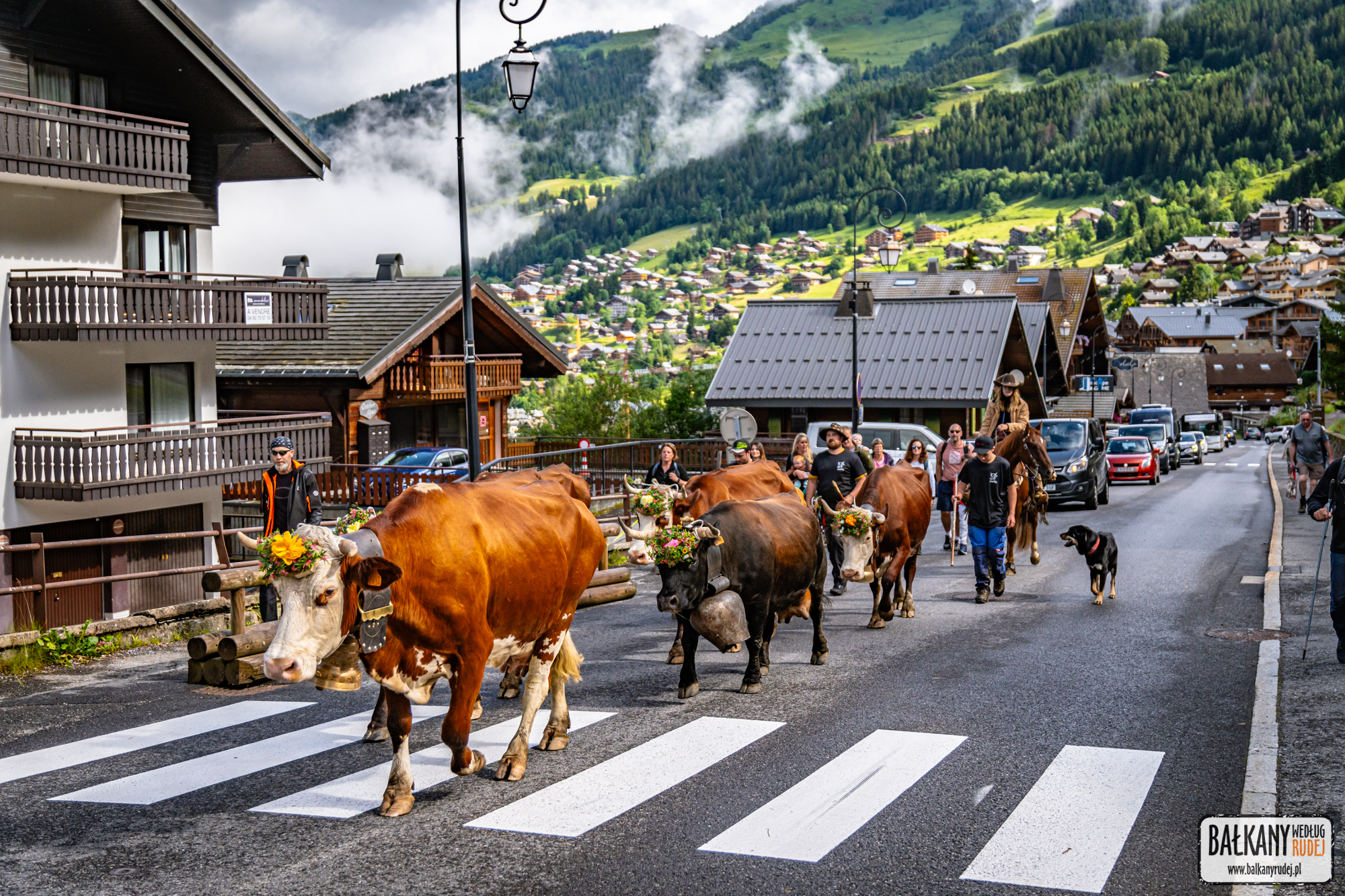 Inną atrakcją, związaną z festiwalem, w jakiej mogliśmy uczestniczyć, była… parada krów. W niedzielę, rano, przez Chatel przemaszerowało stado kilkudziesięciu krów z farmy z Le Petit Châtel. Zwierzaki miały odświętne wianki na głowach oraz ogromne, tradycyjne dzwonki (a zasadniczo bardziej dzwony) na szyjach. Wraz z opiekunami miały do pokonania trasę z miasta do terenu festiwalu. My towarzyszyliśmy im w obrębie samego Chatel.