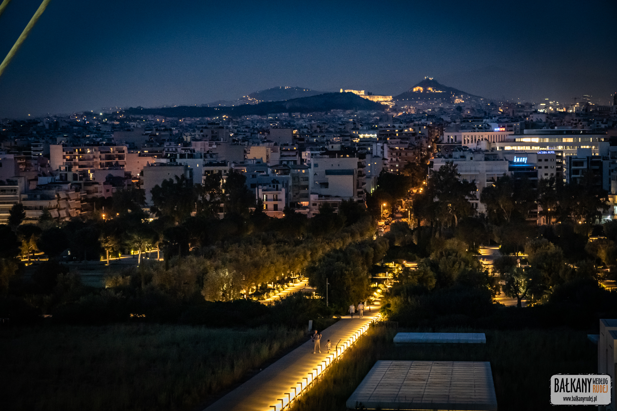 Bez wątpienia jest to jeden z bardziej wyjątkowych punktów widokowych. Bowiem gmach opery (Stavros Niarchos Foundation Cultural Center) oferuje doświadczenia na kilku płaszczyznach. Przede wszystkim dach budynku został zamieniony na park. Porastają go liczne drzewa oliwne i cała masa innych rośliny. W najwyższym punkcie stworzono taras widokowy z kawiarnią. Można się tam dostać windą (za darmo) lub wejść o własnych siłach przez park lub schodami. Podczas zachodu słońca rozciąga się stamtąd genialna panorama Pireusu. Natomiast główna aleja wiodąca z tarasu przez park skierowana jest idealnie na wprost Akropolu. Warto tu też wpaść z innego powodu. Tuż obok budynku opery znajdują się tańczące w rytm muzyki fontanny. Podczas naszej wizyty dodatkowo mogliśmy zajrzeć do wnętrza biblioteki będącej częścią Stavros Niarchos Foundation Cultural Center. W tym czasie trwała tam wystawa World Press Photo.