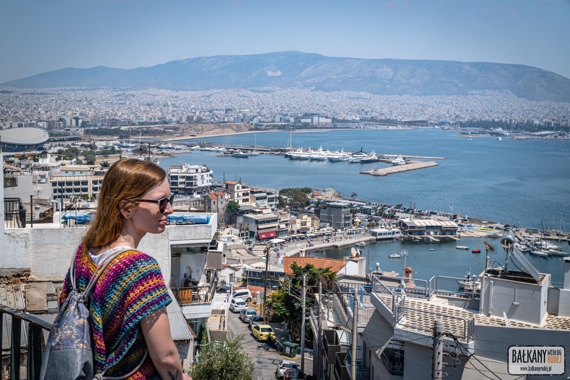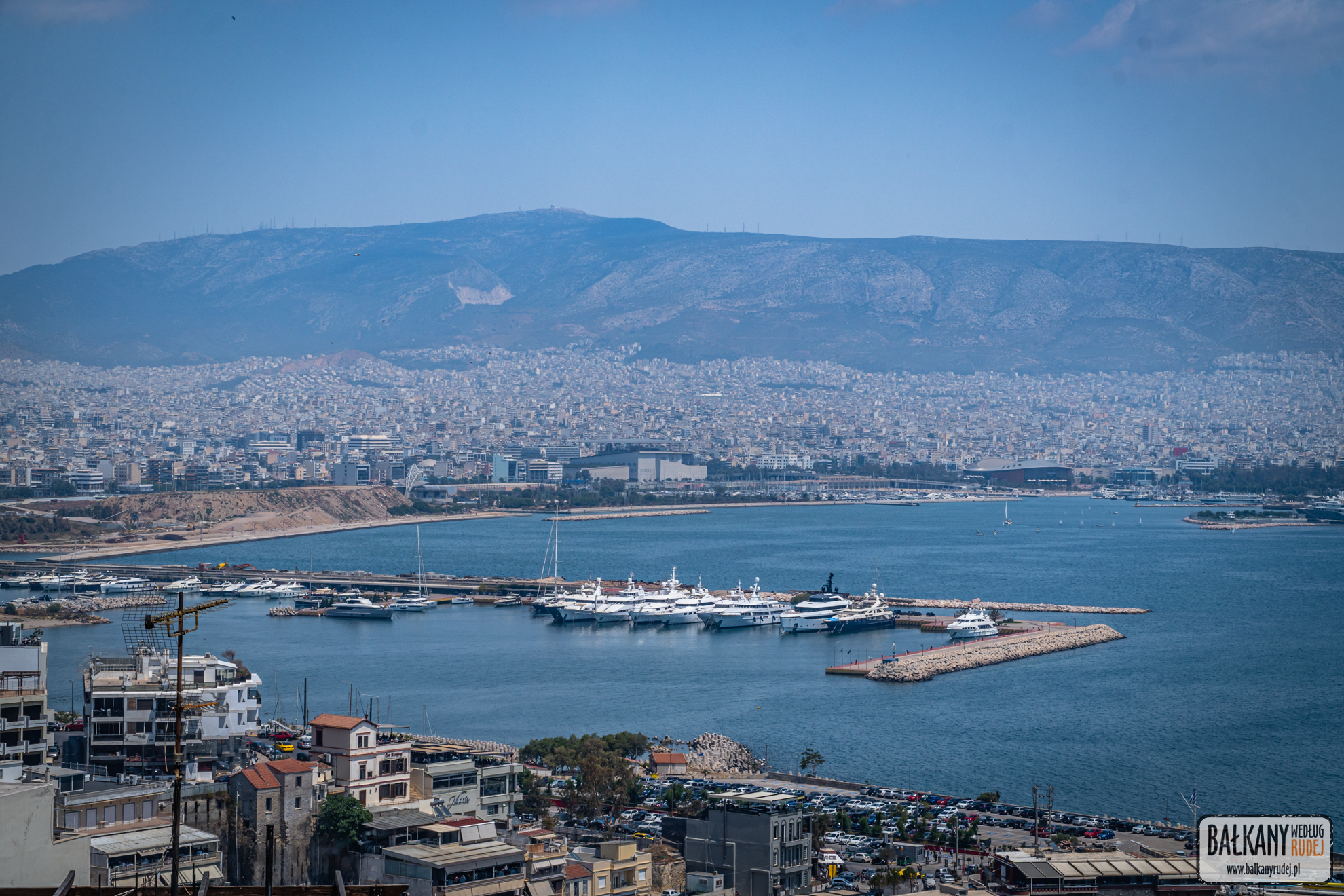 Włócząc się po Atenach czasami trafialiśmy na punkty widokowe kompletnie przez przypadek. Tak było podczas naszej trzeciej albo czwartej wizyty w Pireusie. Naszym celem była restauracja o wiele mówiącej, a raczej nic nie mówiącej nazwie Bowling Center przy ul. Chanion 9. Po wyjściu z tramwaju szliśmy do niej Leof. Vasileos Georgiou. Aby wybić się z niej na wzgórze, na którym znajduje się restauracja, musieliśmy się wspiąć wiaduktem na ul. Koraka. I to właśnie z niego mogliśmy podziwiać jeden z bardziej nietuzinkowych zachodów słońca podczas naszego pobytu w mieście. W głowach rozbrzmiewały nam słowa piosenki If you are going to San Francisco! Ze wspomnianej restauracji również rozciąga się ładny widok w stronę Imittosu oraz wybrzeża. Natomiast nieco poniżej lokalu oraz teatru Veakio, przy ul. Irakliou znajduje się coś na kształt tarasu widokowego. Miejscowi chętnie przyjeżdżają tu samochodami, by podziwiać panoramę miasta.
