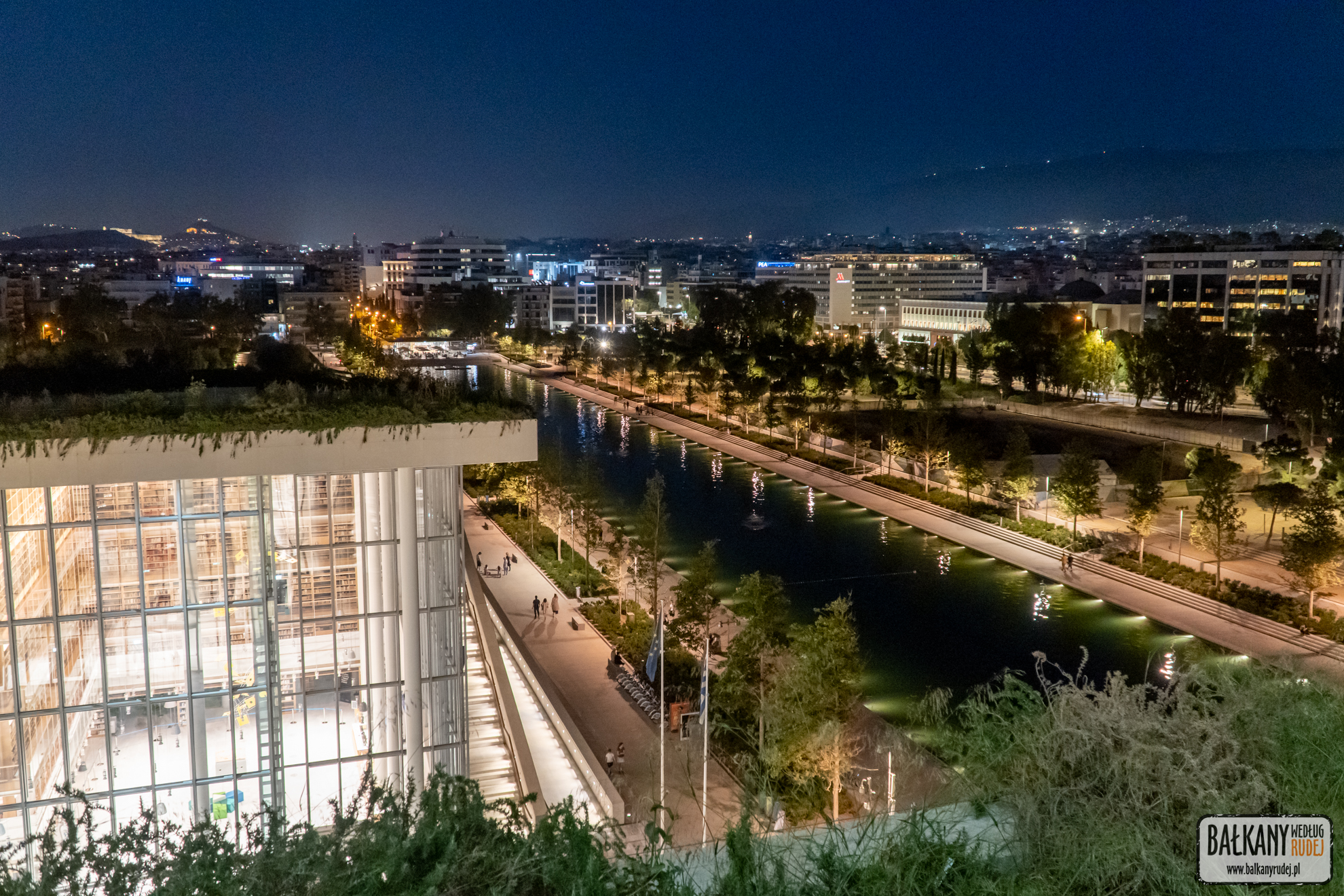 Bez wątpienia jest to jeden z bardziej wyjątkowych punktów widokowych. Bowiem gmach opery (Stavros Niarchos Foundation Cultural Center) oferuje doświadczenia na kilku płaszczyznach. Przede wszystkim dach budynku został zamieniony na park. Porastają go liczne drzewa oliwne i cała masa innych rośliny. W najwyższym punkcie stworzono taras widokowy z kawiarnią. Można się tam dostać windą (za darmo) lub wejść o własnych siłach przez park lub schodami. Podczas zachodu słońca rozciąga się stamtąd genialna panorama Pireusu. Natomiast główna aleja wiodąca z tarasu przez park skierowana jest idealnie na wprost Akropolu. Warto tu też wpaść z innego powodu. Tuż obok budynku opery znajdują się tańczące w rytm muzyki fontanny. Podczas naszej wizyty dodatkowo mogliśmy zajrzeć do wnętrza biblioteki będącej częścią Stavros Niarchos Foundation Cultural Center. W tym czasie trwała tam wystawa World Press Photo.