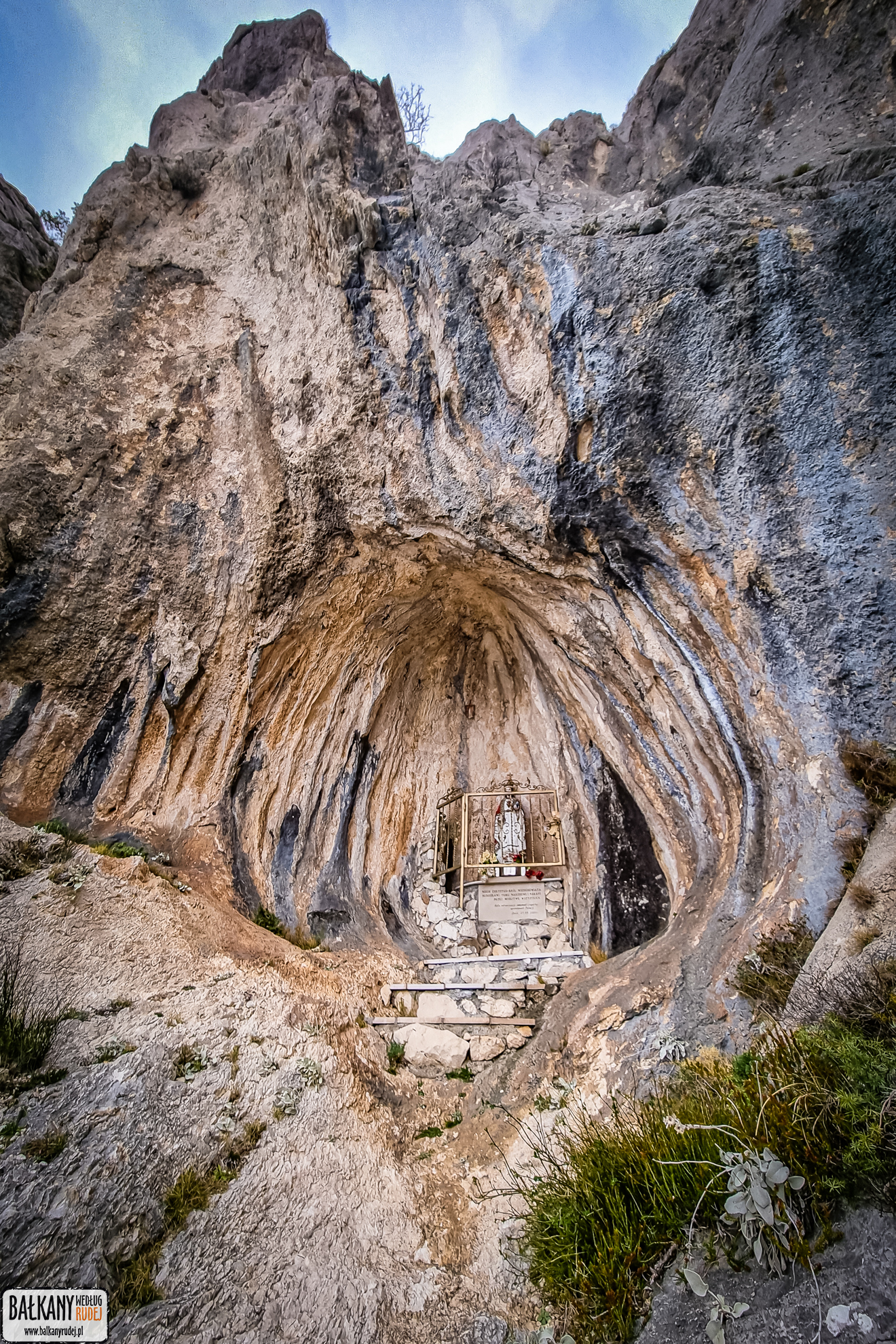 Po dotarciu do miejscowości skręcam na wschód szlakiem, który wiedzie do malowniczo położonego kościółka Gospe od Sniga. Poniżej niego, w skalnej wnęce znajduje się kapliczka z figurą Chrystusa, którą w 2001 roku ufundowali Polacy. O ile niżej szlak uroczo trawersował, o tyle ścieżka prowadząca do kościółka jest naprawdę stroma. Przy niewielkiej, białej świątyni spędzam dosłownie chwilę i zaczynam zbiegać na północną stronę pasemka.