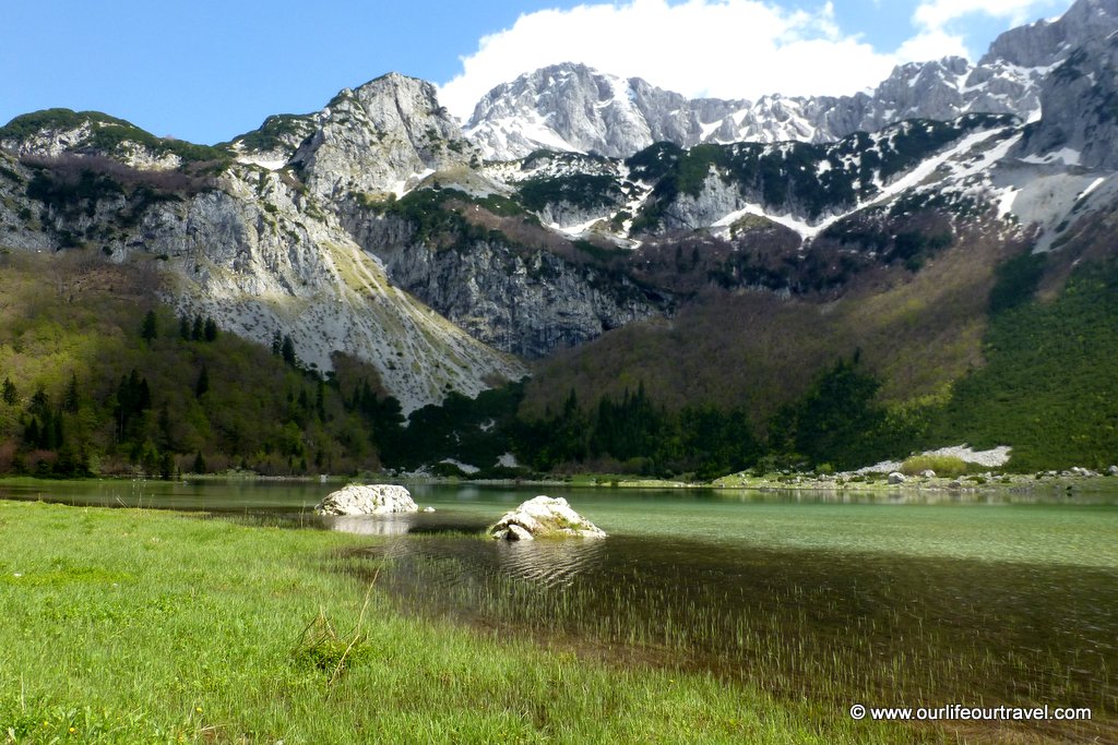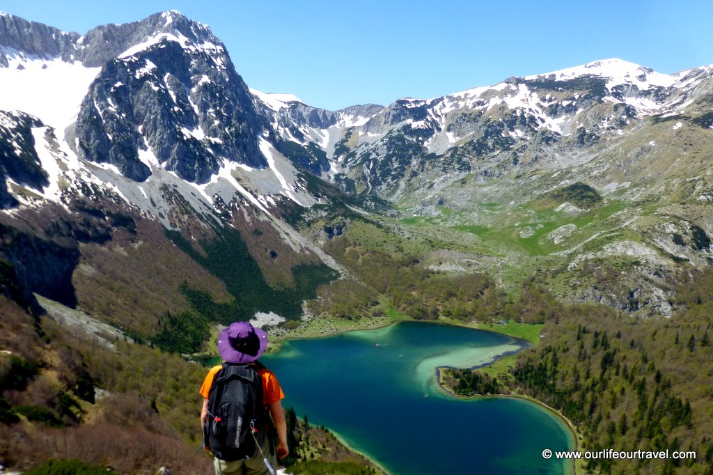 Stąd szlak wiedzie dookoła jeziora i w pewnym momencie prowadzi przez strome zbocze porośnięte młodym lasem. Po wyjściu z tego lasu w końcu pierwszy raz zobaczyliśmy jezioro w pełnej okazałości. Woda ma różne odcienie w zależności od głębokości, a samo jezioro przypomina kształtem serce. Nawet jeśli nie planujecie wyjścia na Maglić to i tak warto podejść pod górę, chociaż kawałek ponad granicę lasu. Dla nas po wyjściu na wysokość jakichś 2000 metrów zaczęły się problemy spowodowane zalegającym śniegiem. Najpierw szlak był przykryty śniegiem tylko miejscami, ale w końcu śnieg całkiem zakrywał ścieżkę na dość stromym zboczu. Po paru obejściach takich płatów zmarzniętego śniegu po ruszających się kamieniach stwierdziliśmy, że zostawimy zdobycie szczytu na naszą następną wizytę w Sutjesce. Zeszliśmy trochę poniżej granicy śniegu i spędziliśmy resztę dnia na delektowaniu się słońcem i widokami.