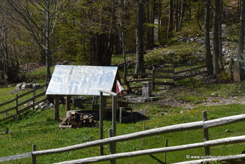 Po tym wyjściu z lasu na brzeg jeziora, pierwsze co zauważyliśmy to polski akcent w postaci flagi zatkniętej na płocie. Łąka nad jeziorem była pełna wiosennych kwiatów. A samo jezioro otoczone jest ze wszystkich stron wysokimi górami i wydaje się, że z doliny nie ma wyjścia oprócz ścieżki, którą właśnie przyszliśmy.