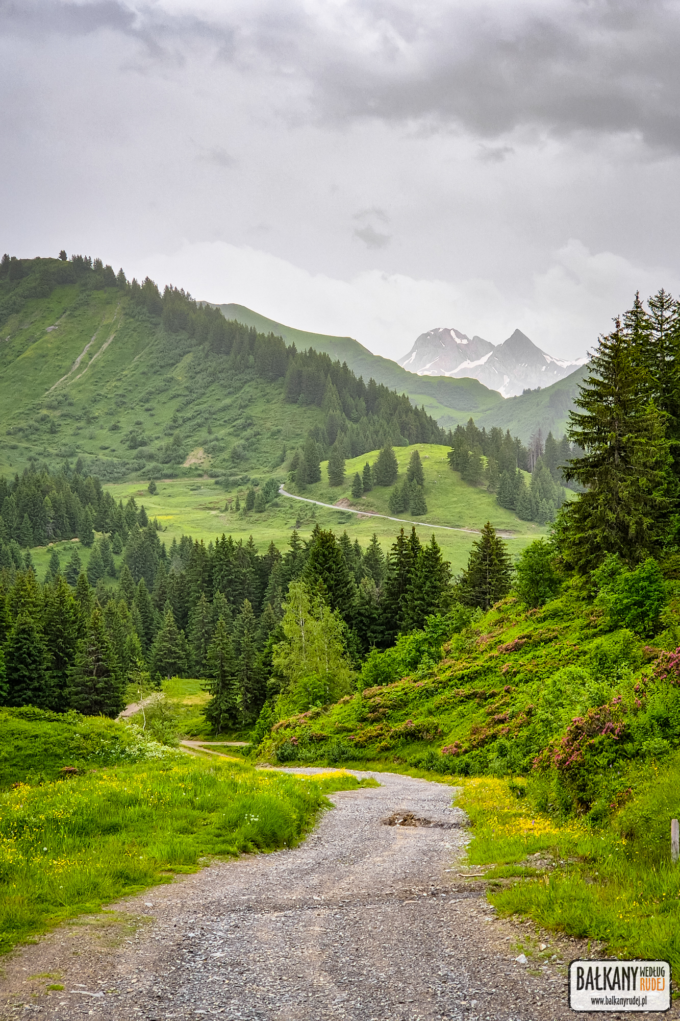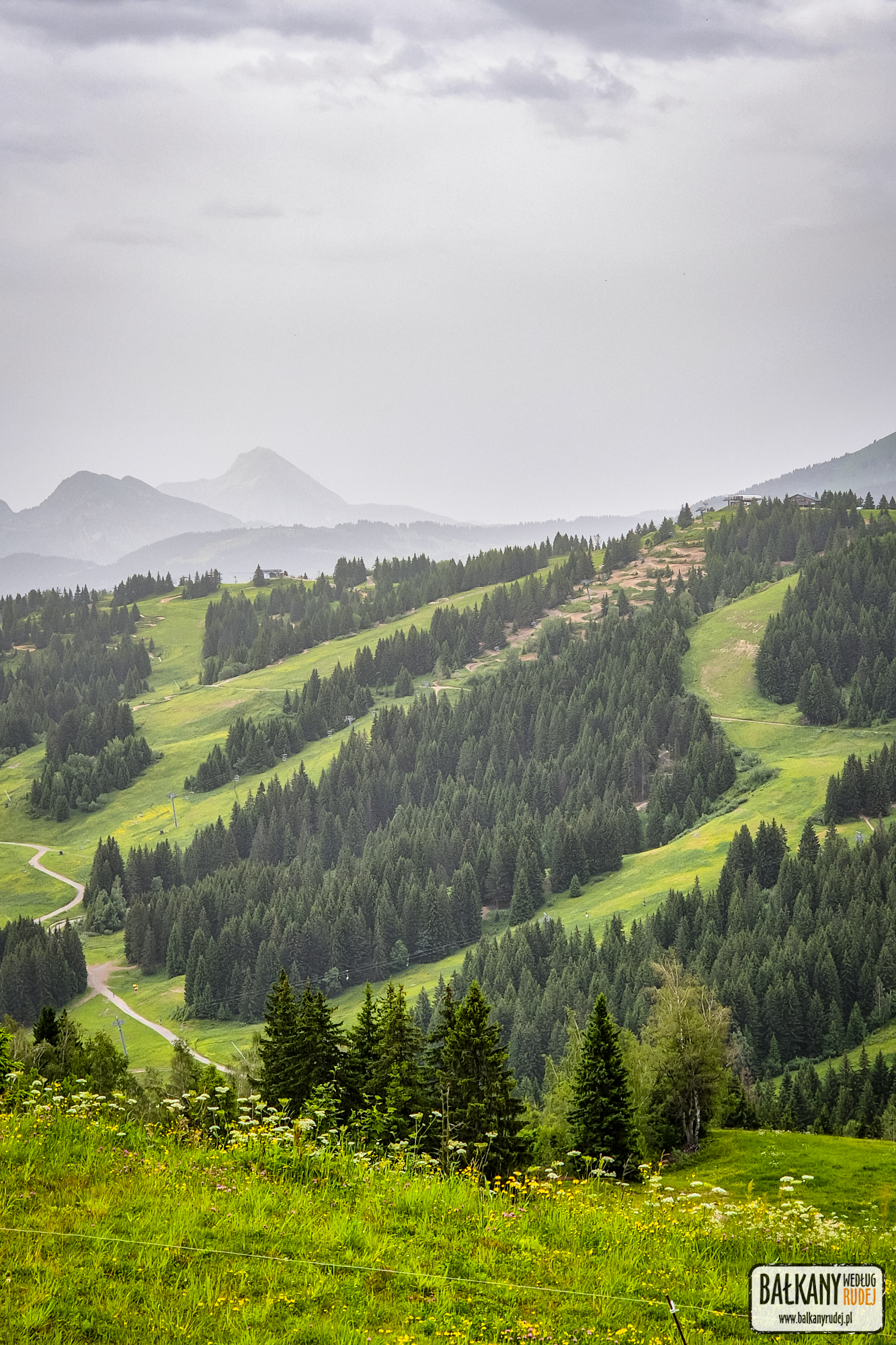 Ponieważ pierwszą część wycieczki skończyłam dość szybko, zdecydowałam się na zrobienie drugiej pętli, która obejmowała teren po przeciwnej stronie Les Gets, w okolicach tamtejszego bike parku. W pierwszej kolejności musiałam wspiąć się Tête des Crêts. Tam spotkałam się z Markiem na jego szybką sesję foto. Później ruszyłam przyjemnymi szutrami na szczyt La Rossetaz. Kiedy zaczęłam schodzić ku Les Gets, nad tę część Alp nadciągnęła burza. Oczywiście ulewa złapała mnie w takim miejscu, że nie miałam się gdzie schować. Przemoczona do gaci zbiegłam trawiastym zboczem do miasteczka.