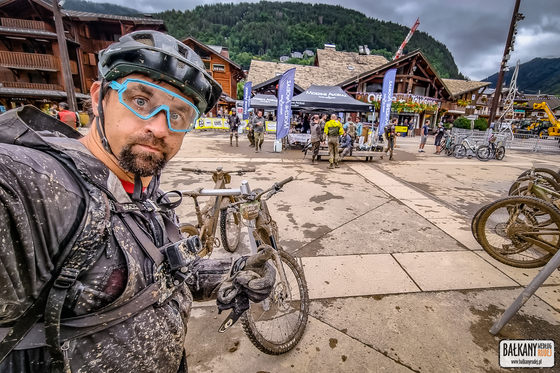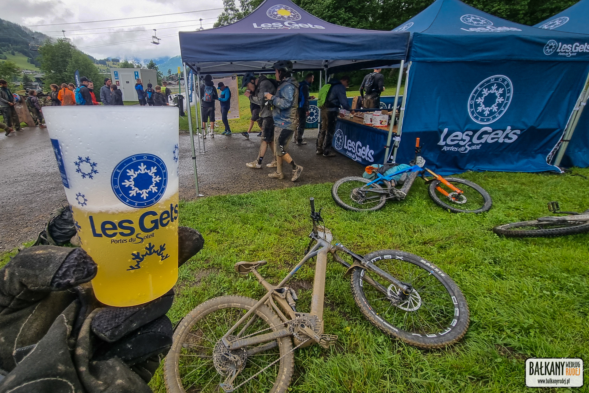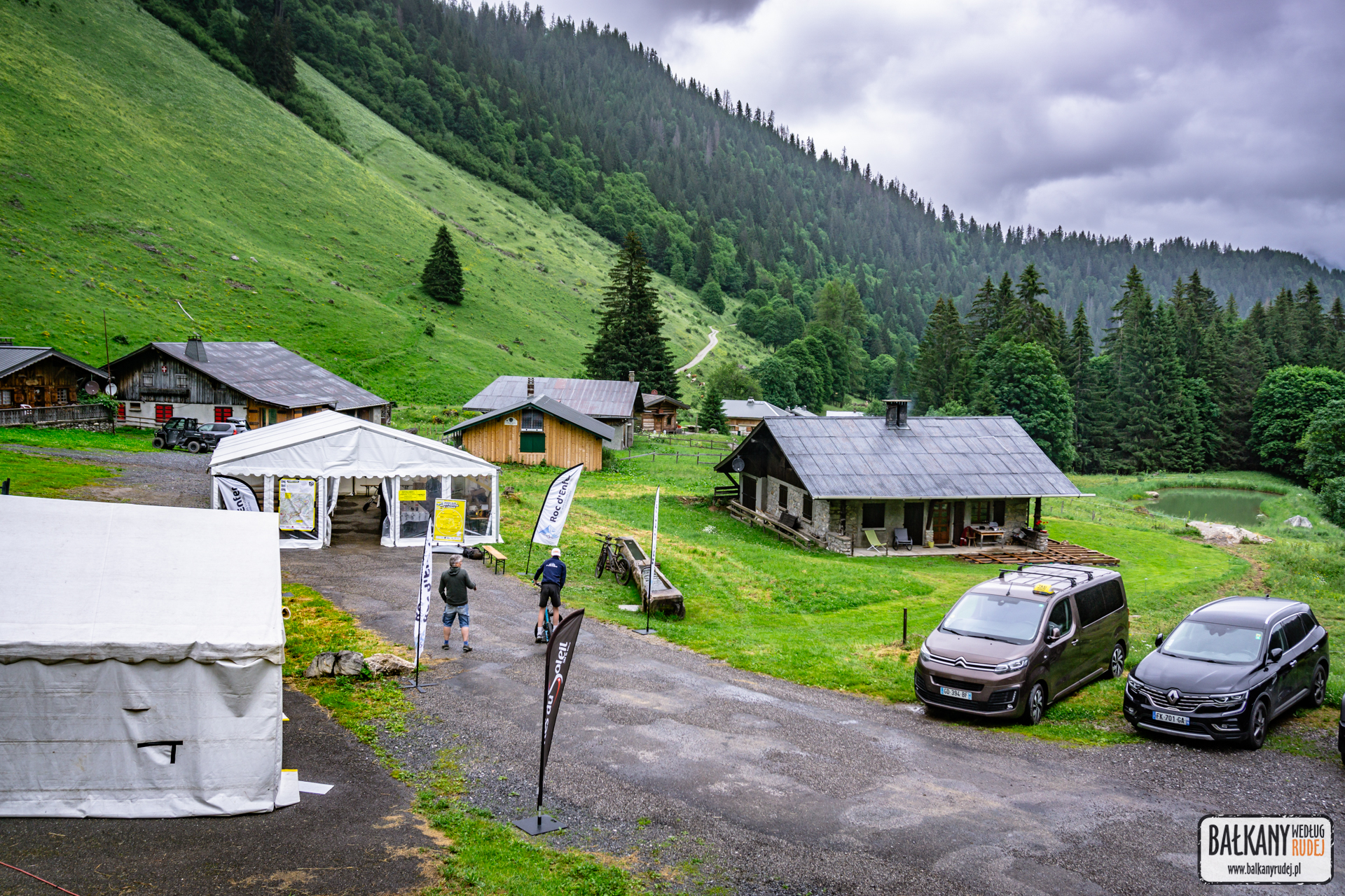 Z Les Gets koleją gondolową wyjechałem w okolice szczytu Mont Cherry. Trasa nie wyjeżdżała na samą górę, ale okrążała szczyt najpierw szutrem, a następnie bardzo ciekawym singlem, który zjeżdżał do przełęczy Col de l’Encrenaz. Stamtąd wspinaczka na dziką przełęcz Col de la Basse i zjazd przyjemnym szlakiem w stronę Les Praz. Warunki tego dnia były mocno wymagające i na stromiznach ciężko było wyhamować, ale zabawa była przednia. Kolejny był bardzo fajny, przygotowany zjazd w stronę Le Plan de Criou. Chętnie tu kiedyś wrócę w warunkach na sucho i z lepszą widocznością. Po tej ciekawej mieszance szutrów, szlaków i singli dotarłem do doliny Graydon oraz do klimatycznej miejscowości, w której zorganizowany był bufet. Tego dnia zdecydowanie przydało się ciepłe jedzenie i napoje.