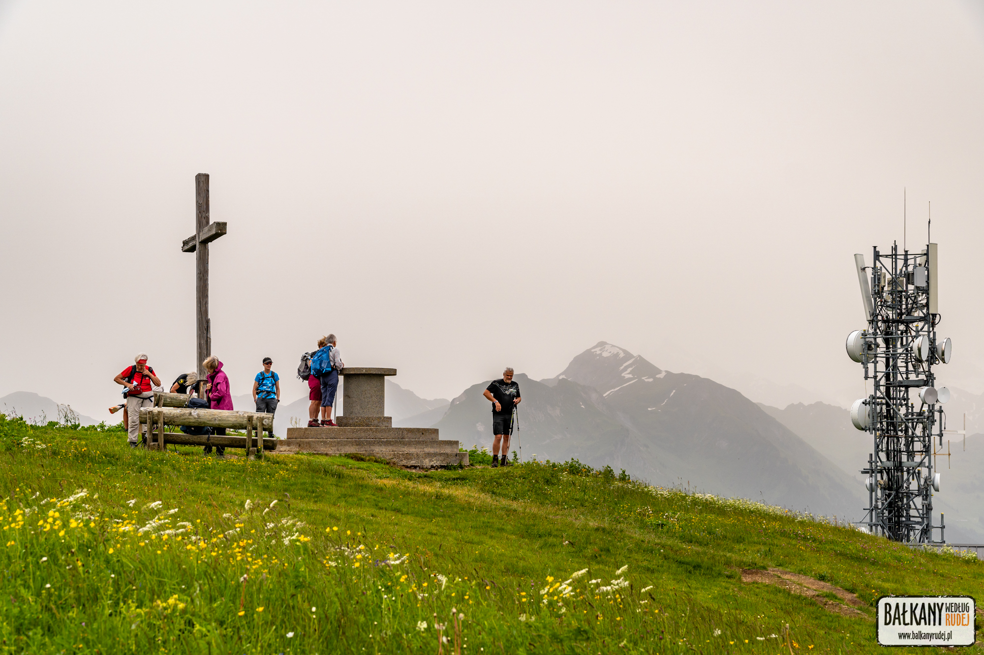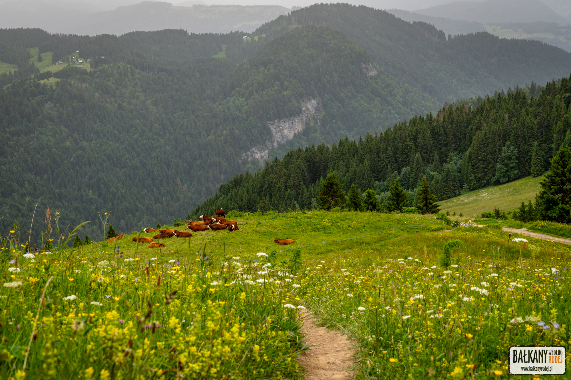 Trasę zaczęłam w centrum miasteczka, obok Centrum Informacji Turystycznej. Stamtąd udałam się wzdłuż kolei gondolowej Mont Chery ku szczytowi o tej samej nazwie. Pieszy wariant Pass’Portes du Soleil nie wchodził na tę górę, jednak rok temu nie miałam okazji jej zdobyć, stąd rozszerzyłam sobie wycieczkę również i o nią. Niestety tego dnia pogoda była dość specyficzna, w efekcie widoków nie miałam za wiele. Z Mont Chery zeszłam cudownym, ukwieconym, zielonym grzbietem do Mont Caly – uroczego przysiółka położonego pośród gór. Tam znów znalazłam się na trasie Pass’Portes. Później czekało mnie dość strome i momentami błotniste zejście do Les Gets. Taki wariant wycieczki miał ok. 11 km. Jako uczestniczka cyklu Pass Portes miałam też dostęp do bufetu z lokalnymi przysmakami.