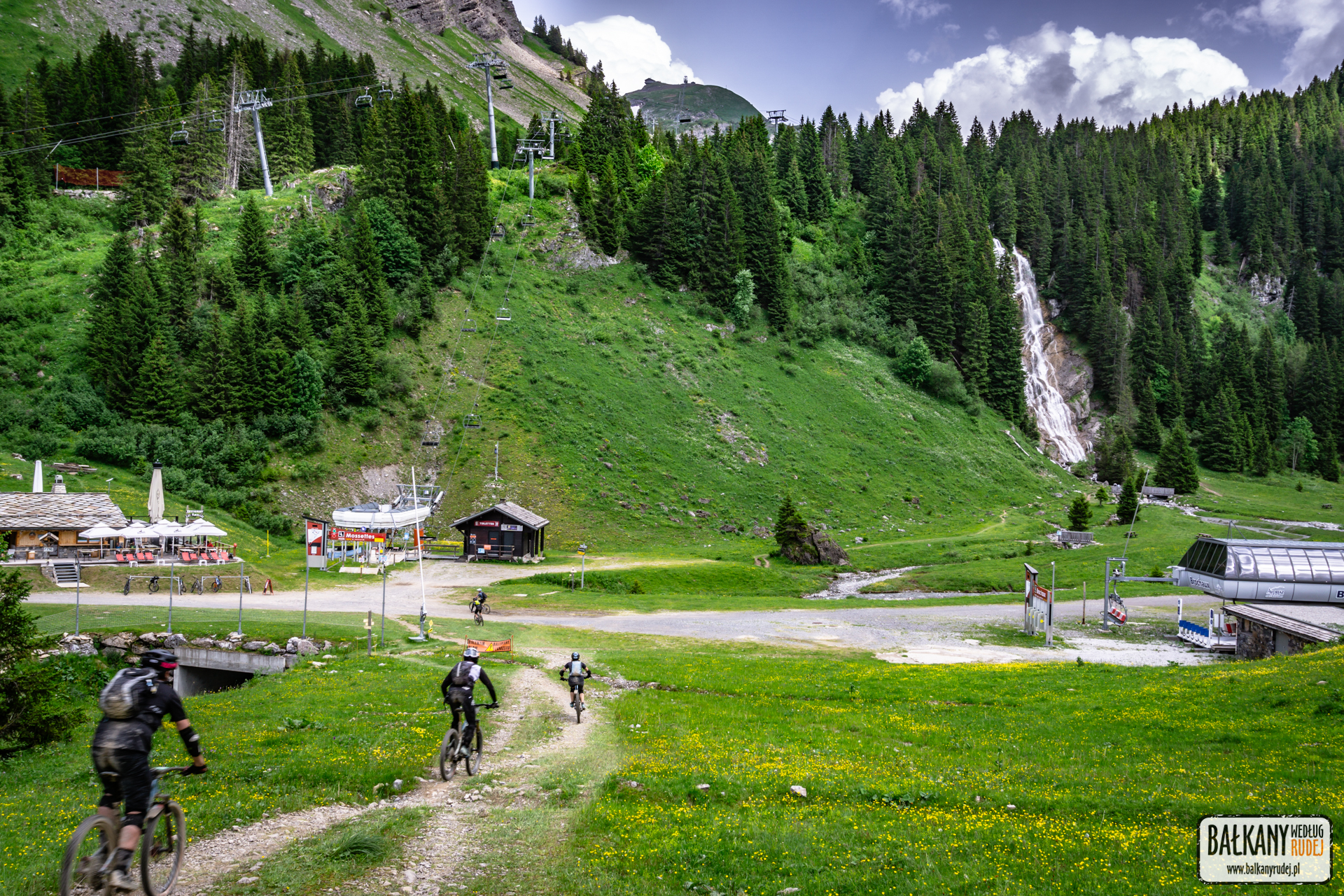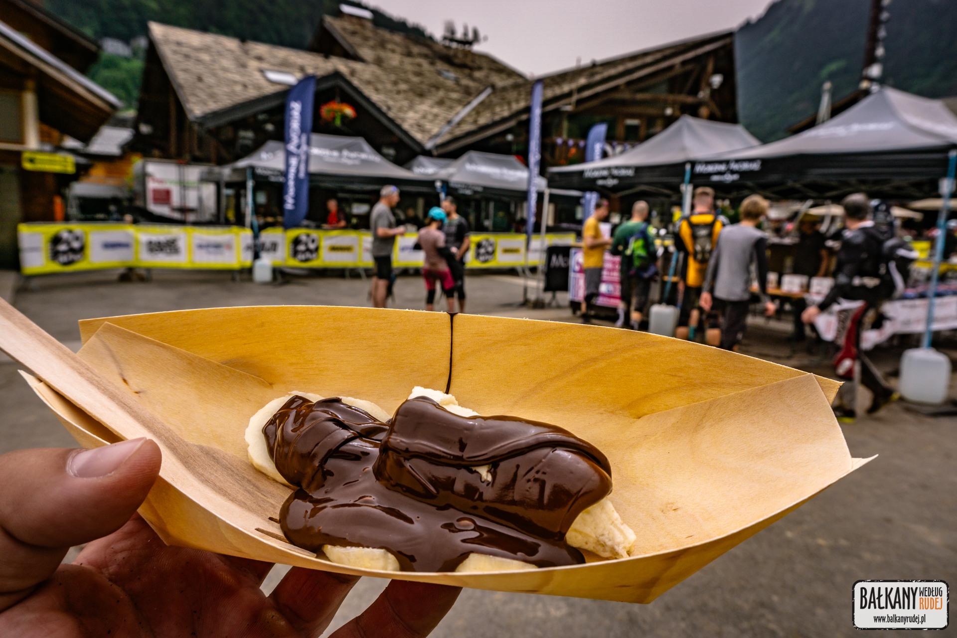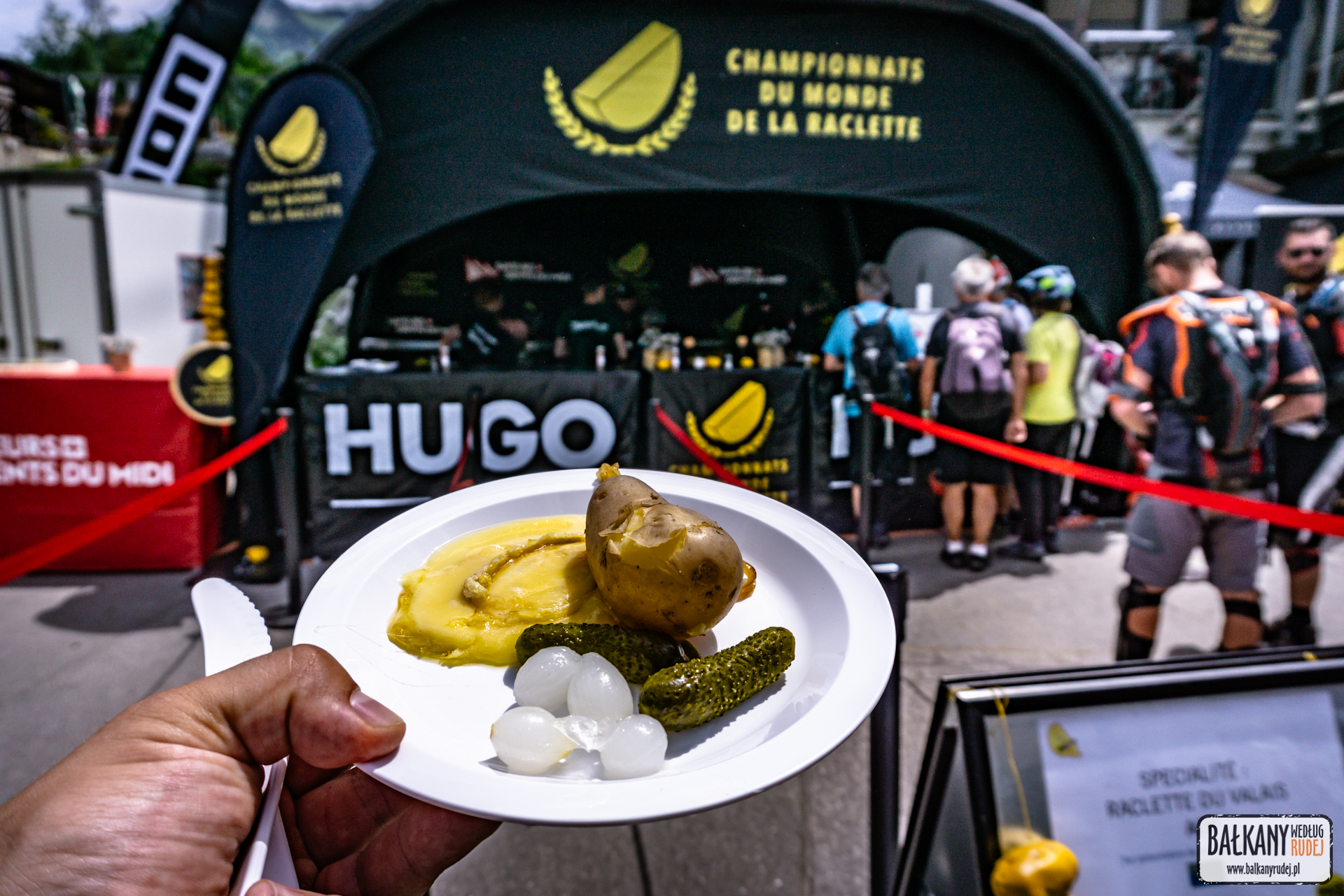 W samym Champery czekał kolejny bufet, w którym tym razem serwowany był specjał Raclette. Pomimo, że głodny nie byłem, to nie mogłem przejść obojętnie obok specjalnie roztopionego lokalnego sera z ziemniakiem. Już wtedy wiedziałem, że raczej odpuszczę gnanie przed siebie, by zrobić całą pętlę jednego dnia. Impreza skłania do luźnej, niespiesznej jazdy i próbowania lokalnych przysmaków, a nie zaliczania kolejnych kilometrów. Zdecydowanie nie miało sensu branie 2 dużych bidonów i zapasów batonów energetycznych. Kolejka linowa w Champery, która sama w sobie jest atrakcją, zabrała mnie do Les Crosets. Tam znów można było zjechać wariantem łatwym, szutrowym, lub bike parkowym DH. Następnie kolejny wyciąg zabierał nas na przełęcz w stronę Francji, skąd bardzo widokowym singlem zjechałem do doliny Les Lindarets.