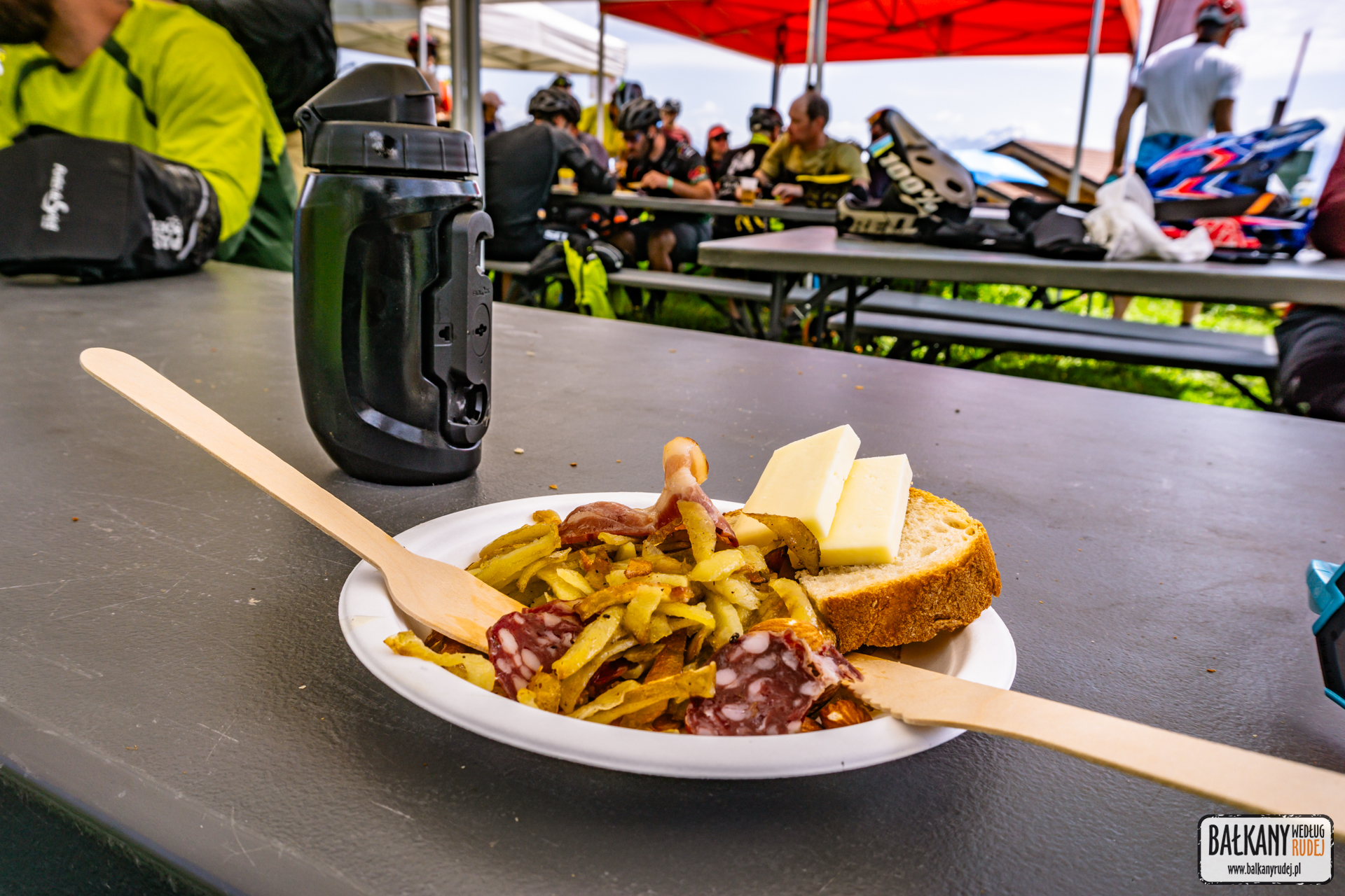W Morgins znów spędziłem chwilę w kolejce do kolejki. Szybko jednak można było o tym zapomnieć, bo ta wywiozła nas do punktu widokowego, z którego można było podziwiać ośnieżone, szwajcarskie szczyty. Kolejnym singlem łączonym z przyjemnymi szutrami dojechałem do Champousin. Tam czekał na mnie pierwszy z bufetów. Było tu absolutnie wszystko. Jako lokalny przysmak – Rostis Valaisans, do tego sery, wędliny, bagietki, czekolady, migdały, soki, woda, izotoniki, piwo i wiele innych. Uczestnicy Pass Portes mają to wszystko w cenie swojej opaski. Limitowane jest tylko piwo: do 3 na dzień. Z Champousin kolejny wyciąg zabrał na widokową grań z pięknym singlem, który wymagał jednak trochę siły na podjeździe. Następnie szutrami i asfaltem można było zjechać do samego Champery. Ale żeby było ciekawiej, to rowerzyści spragnieni większej ilości terenu mogli odbić na oficjalny wariant DH, który prowadził dość trudną trasą tutejszego bike parku. Ja oczywiście wybrałem ten ciekawszy zjazd.