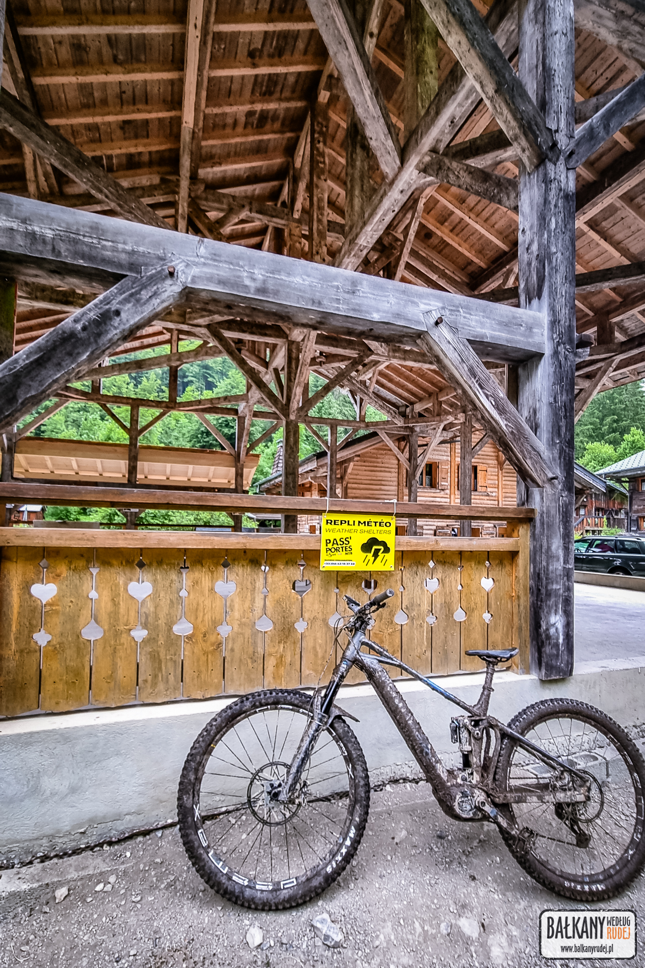 Po opuszczeniu Graydon czekała mnie wspinaczka przez ośrodek narciarski na zboczu La Grande Terche, a następnie szybki zjazd do miejscowości Saint Jean d’Aulps. W dolinie trasa E-Pass Portes fajnie mijała się z głównymi drogami i trzymała przyjemnych singli puszczonych wzdłuż rzeki. Ścieżkami tymi dostałem się do miejscowości Montriond, a następnie ruszyłem w stronę jeziora Lac De Montriond. Deszcz odpuścił i chmury zrobiły tu niesamowity klimat. Po drodze mijałem kilka specjalnie wyznaczonych schronów na wypadek burzy, na szczęście nie przydały się.