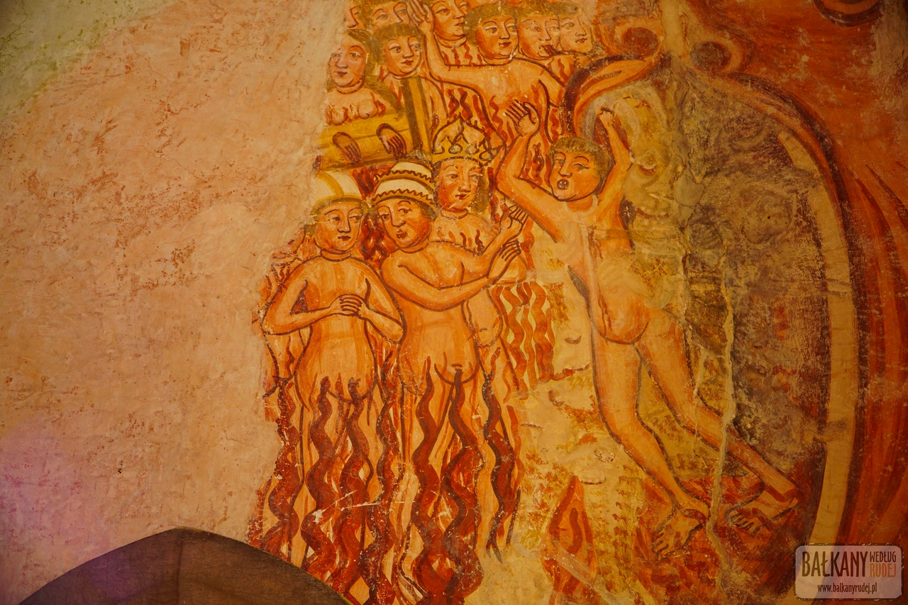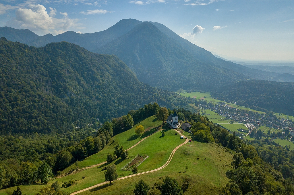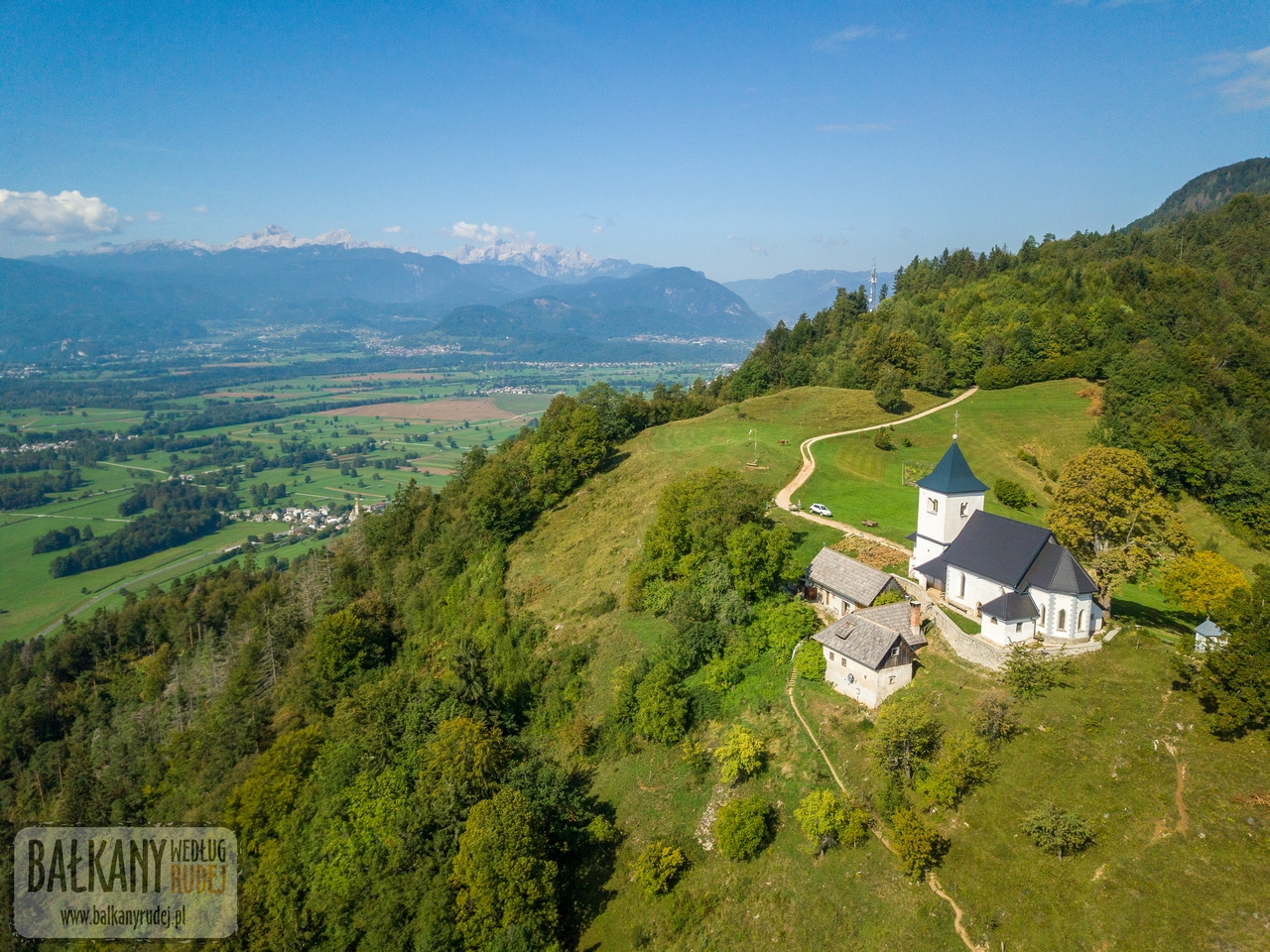 Ze schroniska zjeżdżamy do niżej położonego kościółka św. Piotra. Tuż obok niego znajduje się dom mieszkalny, którego gospodarze zajmują się całym terenem wokół. Mają tu mały ogródek oraz pastwisko dla zwierząt. Z okolic kościoła rozciągają się fenomenalne widoki na Triglav czy samo Begunje na Gorenjskem. Kiedy Marek lata dronem, ja wraz z Saso zaglądam do wnętrza świątyni. Msze odbywają się w niej raz do roku (na święto patrona), natomiast klucze do niej trzyma mieszkający tam gospodarz. Wnętrze kościoła wypełniają całkiem dobrze zachowane freski. Spójrz – są tu wyryte różne napisy. To nie są współczesne akty wandalizmu. Kiedyś wierzono, że pozostawienie po sobie śladu na ścianie świątyni przyniesie szczęście. Zaskakujące jest to, że wyryte daty wskazują na… XVII w.!