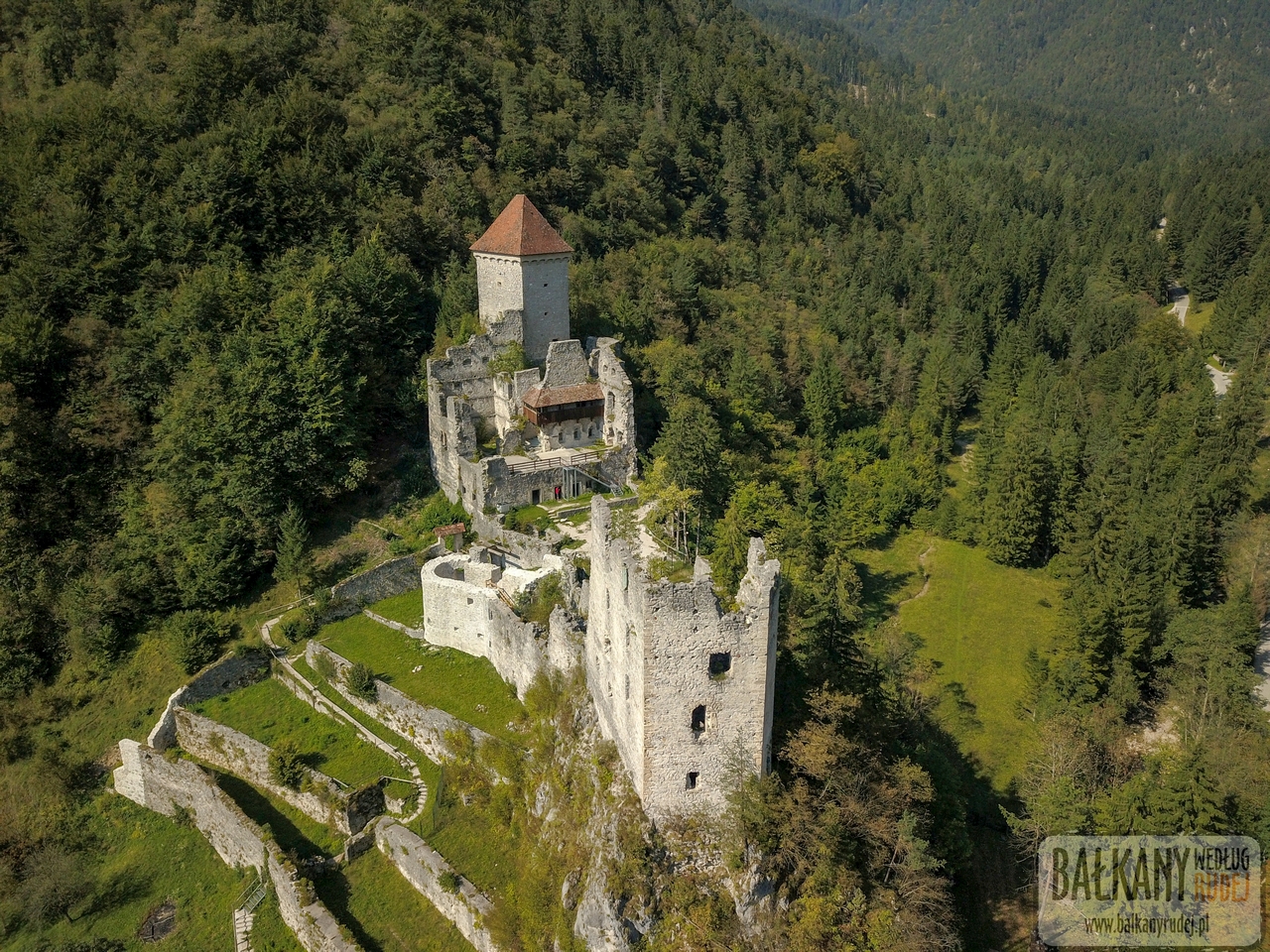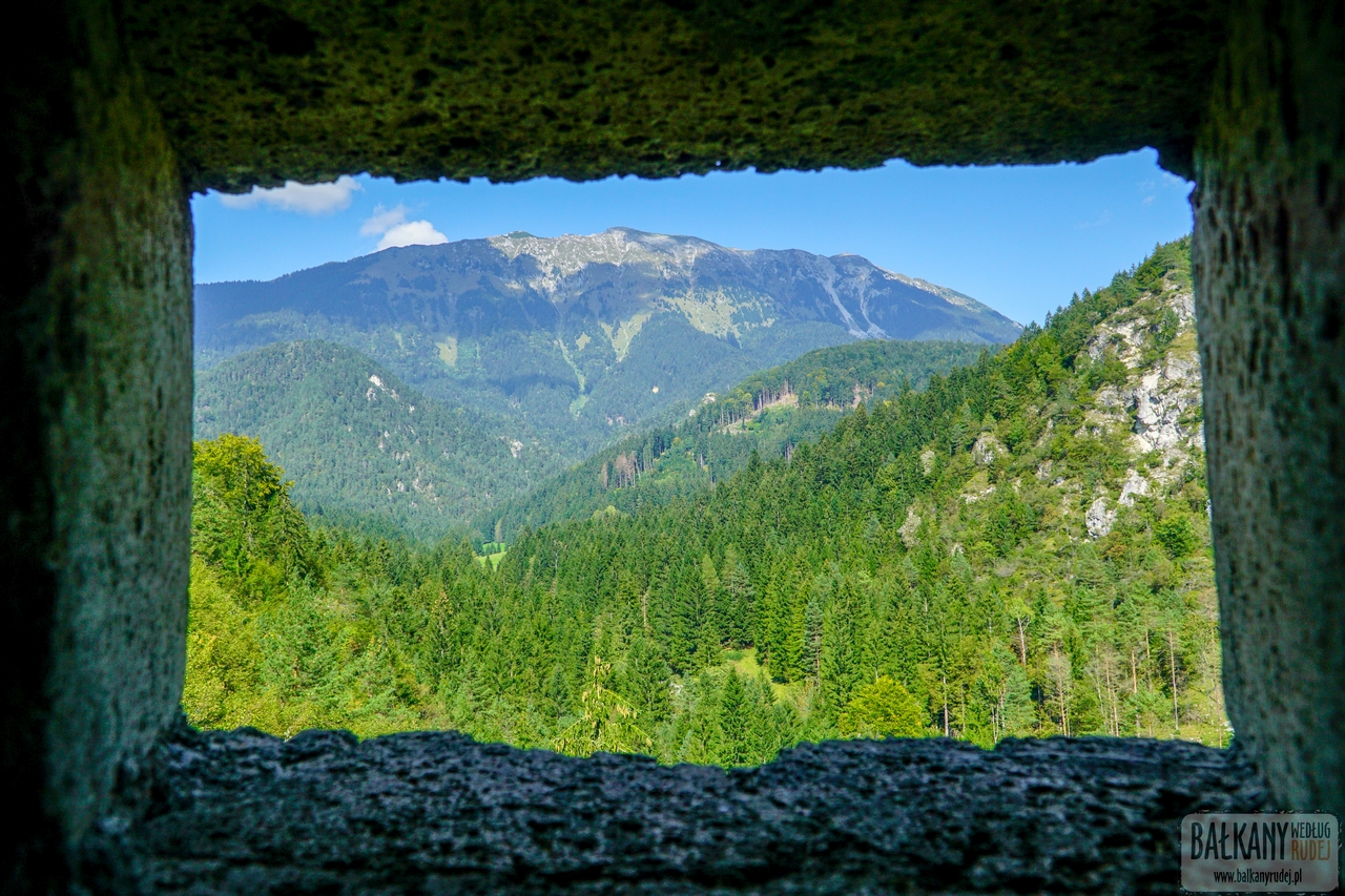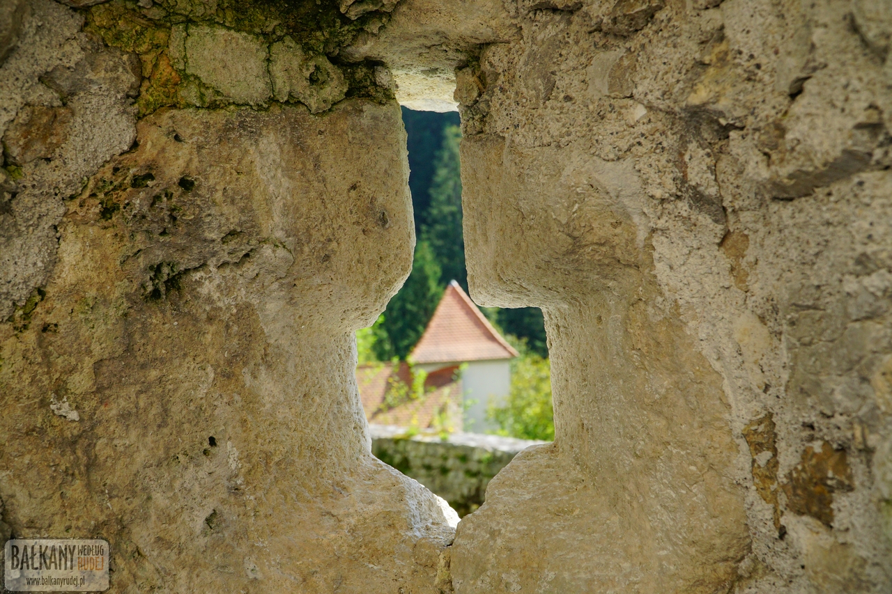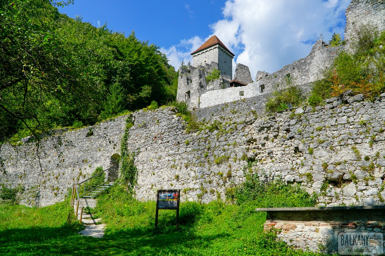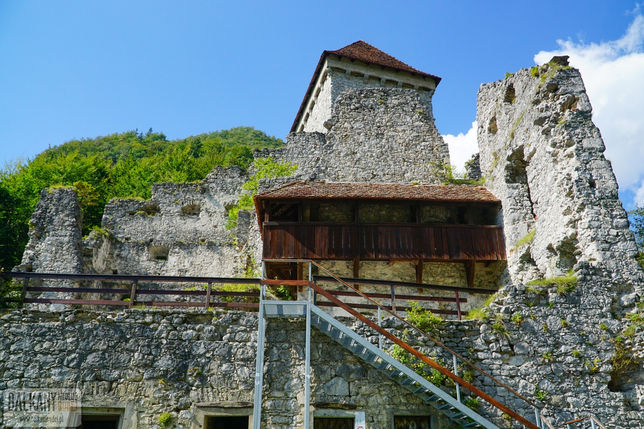 Po zwiedzaniu jedziemy w górę potoku Begunjščicy do restauracji Gostišče Draga, w której swoje wesele miał Saso. Położona jest w lesie, tuż obok potoku, w miejscu skąd zaczynają się szlaki w pasmo Karavanke. Latem, gdy temperatury są naprawdę wysokie, tu zawsze jest chłodniej i można odpocząć od upałów. Restauracja specjalizuje się w rybach i dziczyźnie. I mimo tego, że znajduje się na uboczu, to jest w niej sporo gości. Dania są naprawdę bardzo smaczne (Marek pałaszuje gulasz z jelenia, ja zaś kaiserschmarrn, które teoretycznie traktowane jest jako deser, ale dla mnie idealnie spełniło rolę dania obiadowego). Po posiłku wracamy w stronę Begunje na Gorenjskem, by zwiedzić ruiny zamku Kamen. Niegdyś była to naprawdę imponująca budowla. Cały czas zbieramy środki na rekonstrukcje zamku. Z racji tego, że wciąż ma kilku właścicieli, trudno jest zdobyć wszelkie zgody na zaadaptowanie go na potrzeby turystyczne. Ruiny są ogólnie dostępne i za ich zwiedzanie nie jest pobierana opłata. Dawna część mieszkalna została całkiem nieźle odbudowana, podobnie jak część murów. Na zamku spotykamy parę Niemców, którzy mieli ze sobą trzy, „malutkie”, kudłate pieski. Zaczęliśmy się śmiać, że aby się z nimi pomieścić, przyjechali do Słowenii tirem.