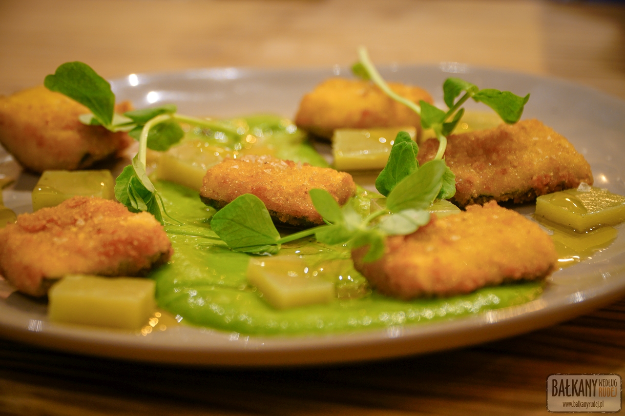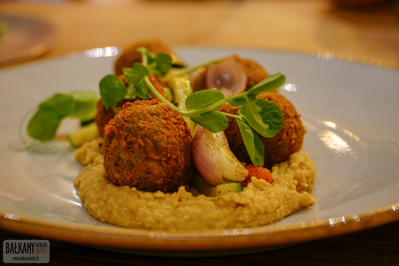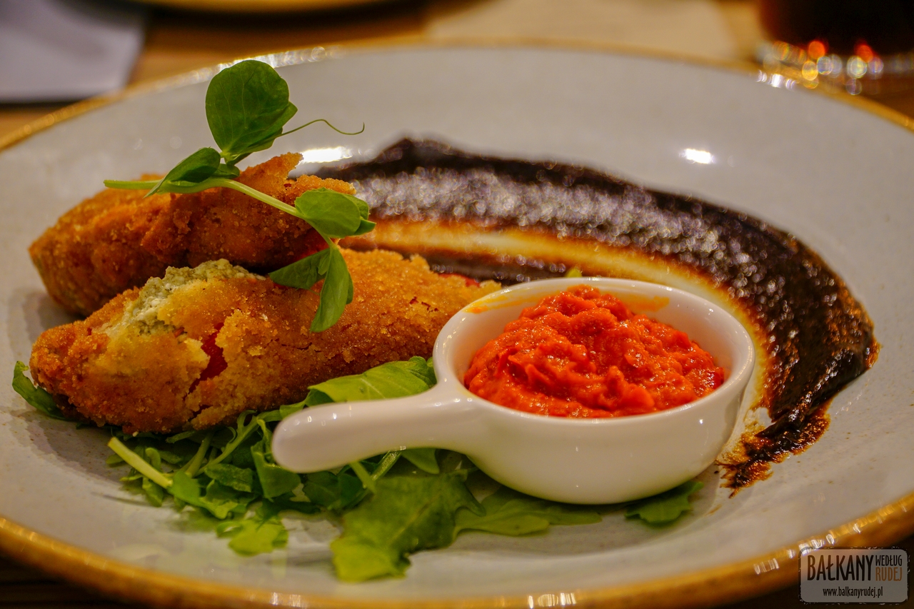Restauracja Na Bałkany od razu u mnie zapunktowała, gdyż posiada kilka wege dań. Po rekomendacji Violi i Rafała decyduję się na falafele z hummusem oraz paprykę faszerowaną serem sirene. Marek poszedł w nieco bardziej tradycyjną stronę, czyli ćevapy z kajmakiem i pilafem z kaszy pęczak. Mogliśmy również skosztować panierowanych cukinii, natomiast Marek spróbował również krewetek. Uważam, że prawdziwym hitem jest faszerowana papryka, do której dodatkiem jest sos śliwkowy. Moim zdaniem to połączenie jest kulinarnym majstersztykiem – słony ser, wytrawna śliwka plus aromatyczna papryka. Falafele były smaczne, ale odrobinę za suche, natomiast hummus był perfekcyjny. Marek bez wątpienia zachwycił się ćevapami, ale chyba najmocniej kajmakiem, który powstaje na miejscu wedle „tajnej receptury”. Dania nie dość, że smaczne, to były oczywiście ślicznie podane.