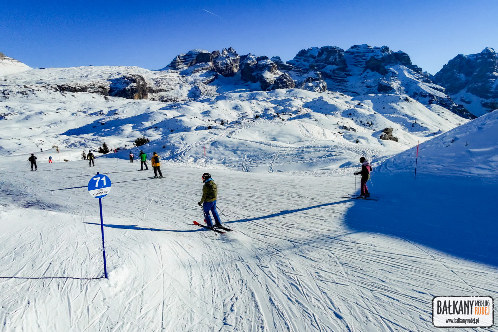 Ja parkowałem w centralnym punkcie ośrodka, przy dolnej stacji kolei gondolowej, na przełęcz Groste. To właśnie przy niej są najwyżej położone stoki całego ośrodka, które dodatkowo oferują piękne widoki na szczyt Pietra Grande oraz inne niesamowite formacje skalne Dolomitów Brenta. Groste to zdecydowanie punkt obowiązkowy dla odwiedzających te okolice, zwłaszcza przy ładnej pogodzie. Z racji tego, że nie było warunków na zabawy poza stokiem, to wycieczkowo objechałem sobie większość stoków, również po drugiej, słonecznej stronie doliny i miejscowości Madonna di Campiglio. Zajrzałem też na trasy Marilevy i Folgaridy. Pomimo weekendu i wysokiego sezonu ruch rozkładał się równomiernie na tyle wyciągów, że nie było żadnych większych kolejek i jazda szła sprawnie. Całodniowy skipass w sylwestrowym sezonie kosztował mnie 85 EUR, więc nie mało. Ale bardzo miło wspominam tę wycieczkę. W sumie tego dnia przejechałem na nartach ponad 61 km, robiąc ponad 11 tys. metrów przewyższenia.