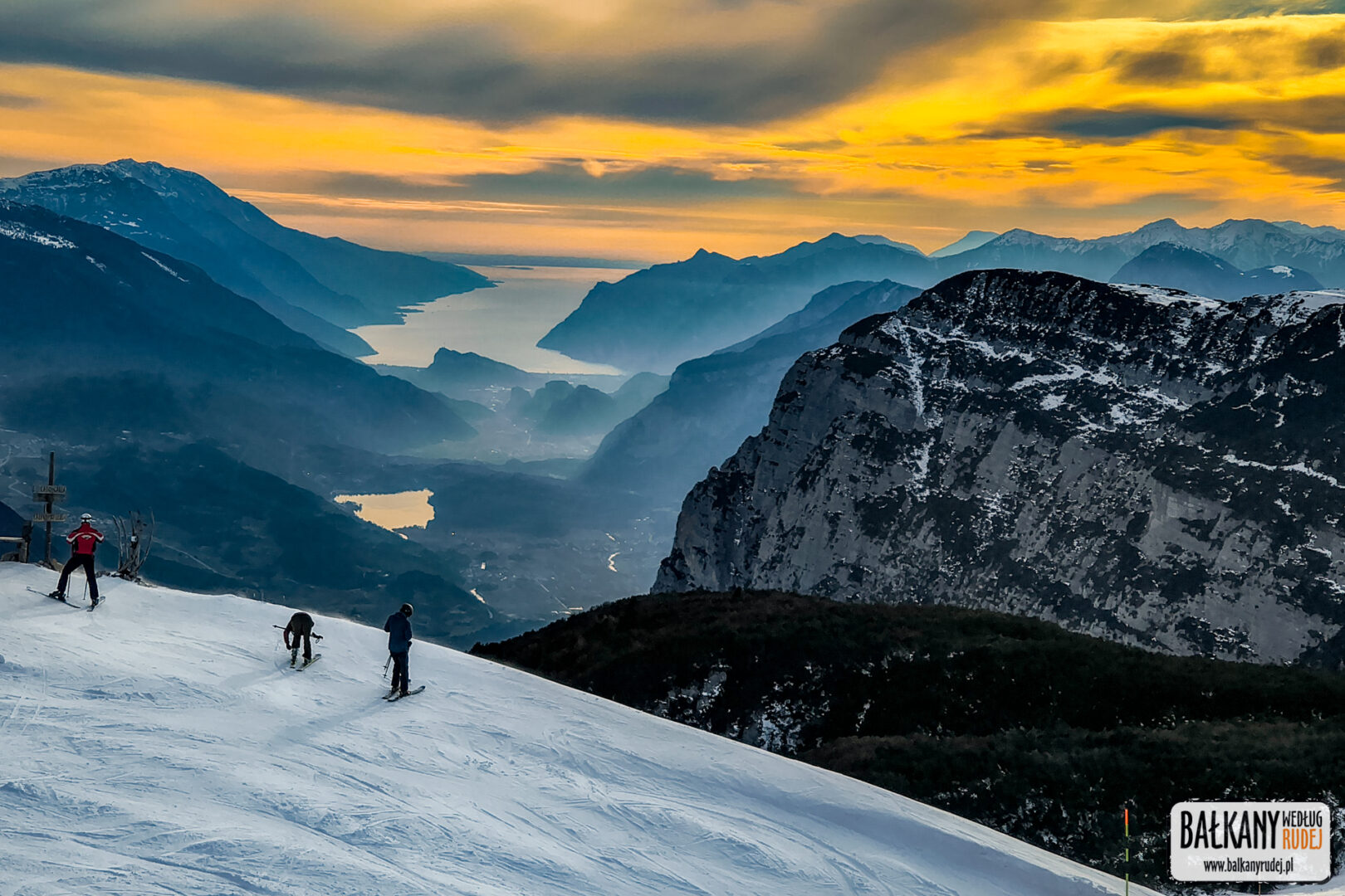 Paganellę odwiedziłem latem, ale oczywiście na rowerze (wtedy działa tu rozbudowany bikepark) i z chęcią wróciłem tu z nartami zimą. Jest to ośrodek zdecydowanie mniejszy niż ten w Madonnie di Campiglio, ale nadal do dyspozycji jest tu ponad 50 km tras narciarskich. Zdecydowana większość z nich znajduje się na szczycie Cima Paganella. Wyciągi łączą tu kurort Andalo oraz okolicę miejscowości Fai della Paganella. Dodatkowo pojedyncze stoki znajdują się w miejscowości Molveno. Szczyt Cima Paganella liczy 2125 m n.p.m. i z jednej strony oferuje stoki o różnym nachyleniu, natomiast z drugiej jest to wysoki skalny klif, który schodzi prosto do głębokiej doliny. Dzięki temu oferuje piękne i rozległe widoki 360 stopni. Mogłem z innej strony spojrzeć na Dolomity Brenta. Co ważne, widać było w oddali jezioro Garda, nad którym byliśmy jeszcze tego samego ranka.