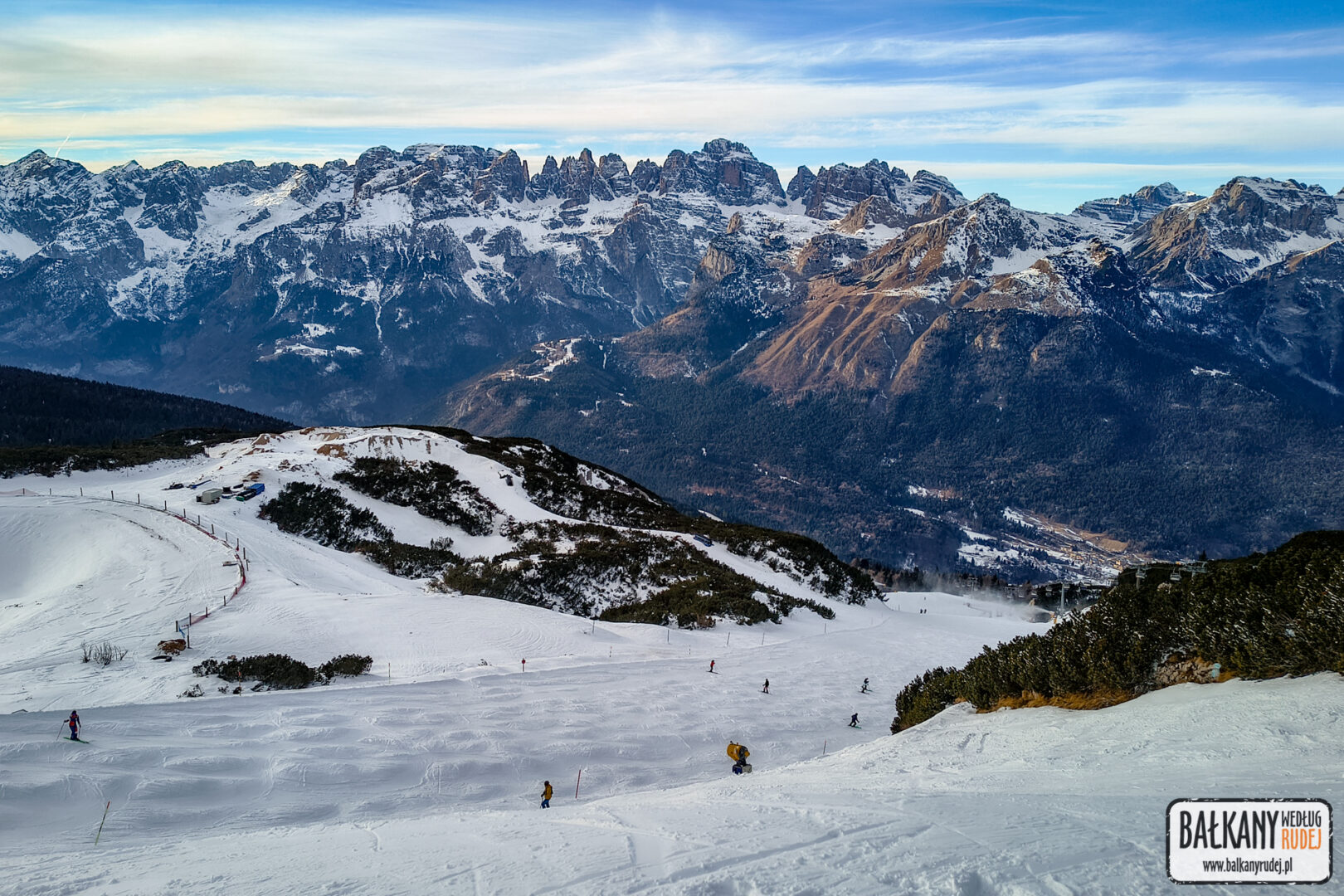 To bez wątpienia jeden z bardziej znanych ośrodków narciarskich w tym regionie. Oferuje szeroką gamę tras: od łagodnych niebieskich nartostrad, po strome czarne trasy zjazdowe, na których rozgrywane są zawody Pucharu Świata w narciarstwie alpejskim. Sama miejscowość jest niewielka i schowana w dosyć ciasnej dolinie, ale kompleks narciarski rozciągający się wokół łączy kilka różnych kurortów i miejscowości, takich jak Marileva, Folgarida, czy Pinzolo. Na wszystkie trasy obowiązuje 1 skipass, dzięki któremu można zdobyć w sumie ponad 10 różnych szczytów rozsianych wzdłuż długiej doliny. Łącznie do dyspozycji jest tu ponad 150 km przygotowanych tras. Na początku stycznia 2026, nawet na wysokości 2500 m n.p.m., śniegu nie było bardzo dużo. Ale dzięki mrozom prawie wszystkie trasy były dobrze dośnieżone i utrzymane.