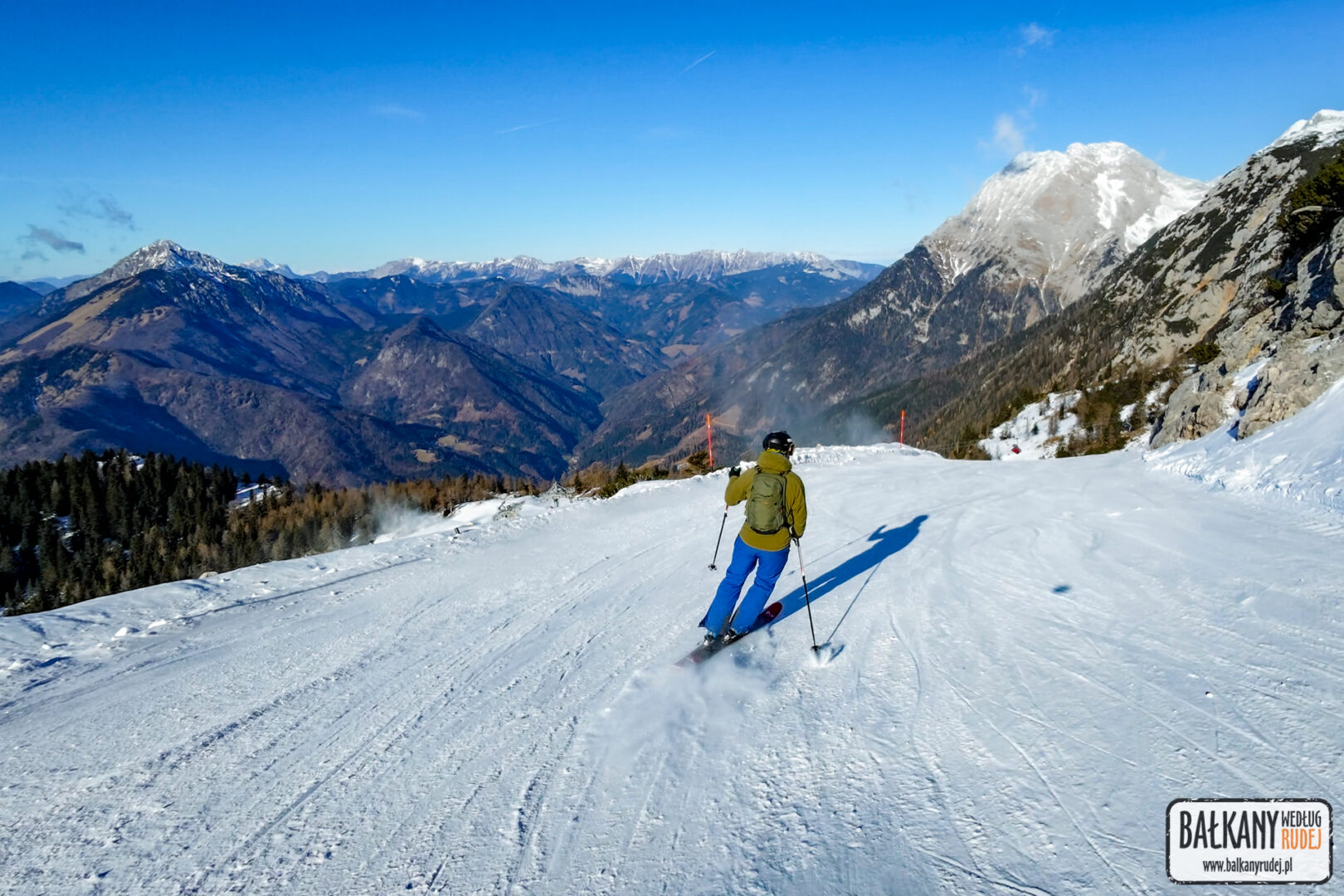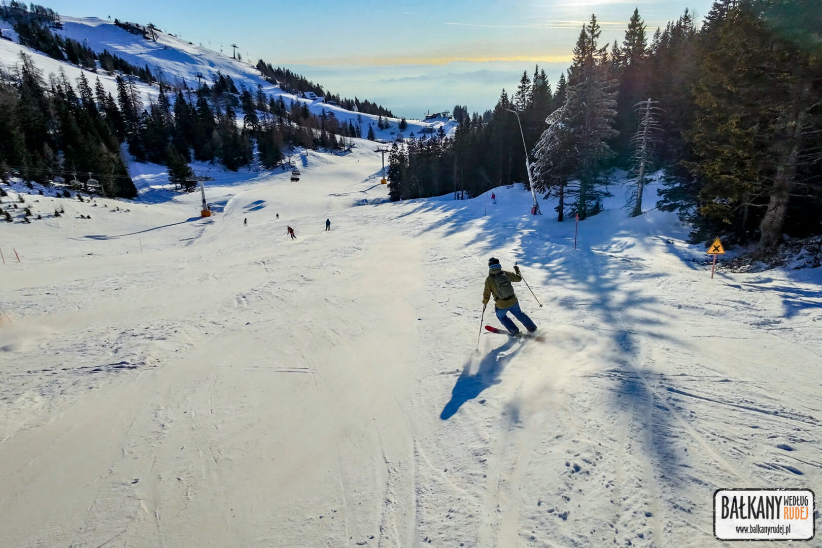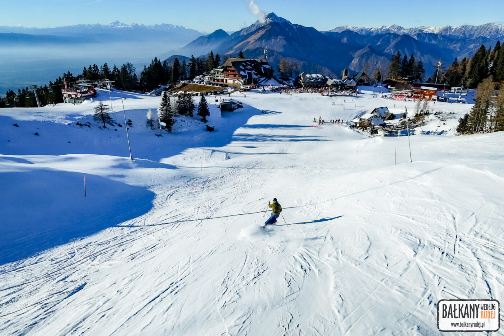 Krvavec odwiedzaliśmy już wcześniej zarówno wycieczkowo/trekkingowo, jak i rowerowo. Jest to jeden z większych ośrodków narciarskich Słowenii, który dodatkowo leży bardzo blisko Lublany. Pomimo, że pod koniec grudnia 2025 było bardzo mało śniegu, to tu przygotowanych już było kilka tras narciarskich. Wszystko dzięki temu, że główne stoki położone są na wysokości ok. 1600 – 2000 m n.p.m. Z głębokiej doliny, wygodnie można dostać się koleją gondolową, a trasy obsługują już kolejne wyciągi krzesełkowe. Jak na niewielką ilość śniegu, to warunki oceniam jako dobre. Dzięki mrozom na dużej wysokości, ośrodek był w stanie wykorzystać armatki i wspomóc nieco naturalne opady. Chociaż nadal nie były otwarte wszystkie stoki i wyciągi, to dobrze było się narciarsko rozruszać. Przy słońcu i dobrej widoczności, szusowanie na Krvavecu to czysta przyjemność, pośród pięknych krajobrazów. Za całodniowy karnet zapłaciłem 49 EUR.