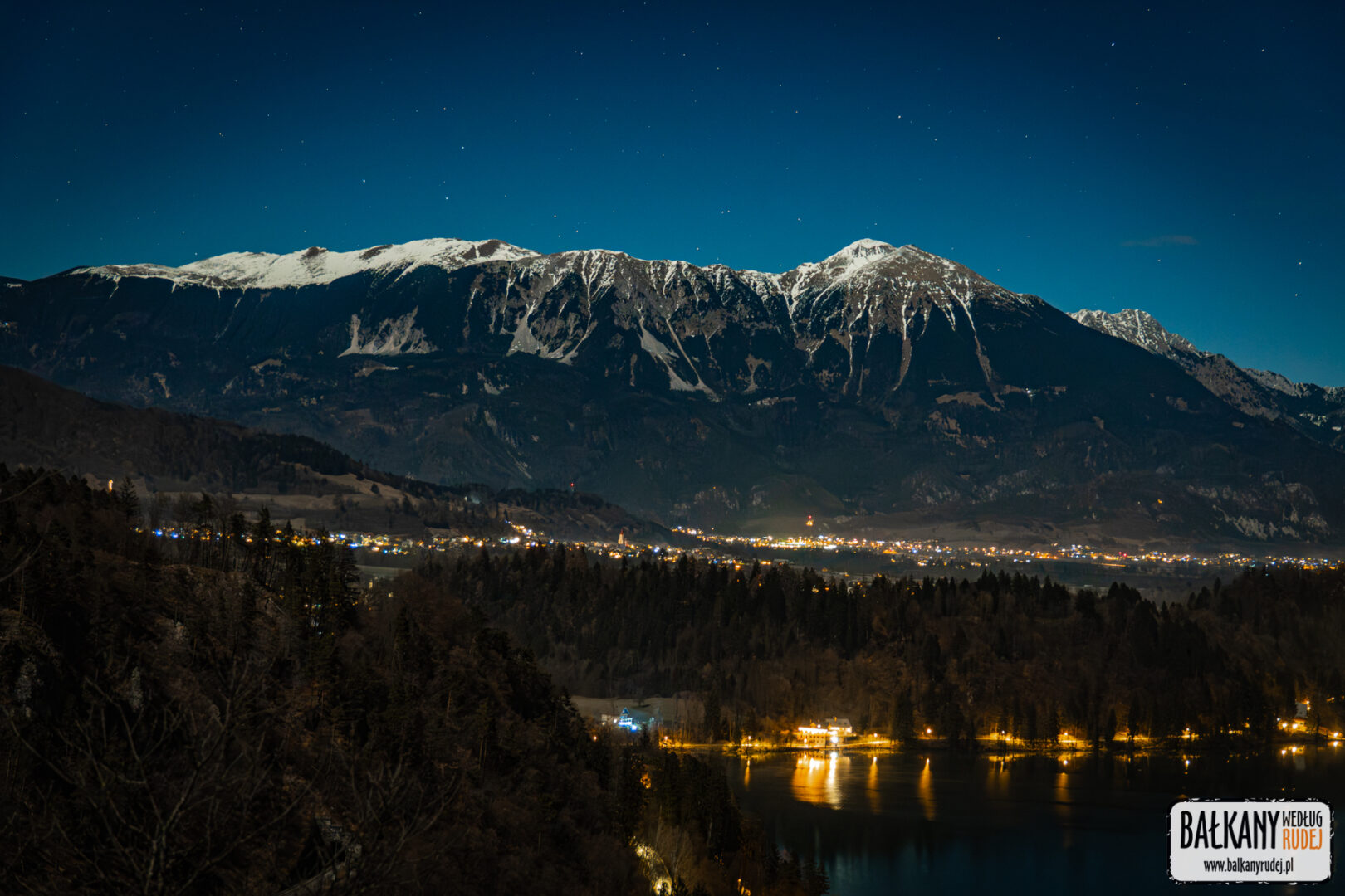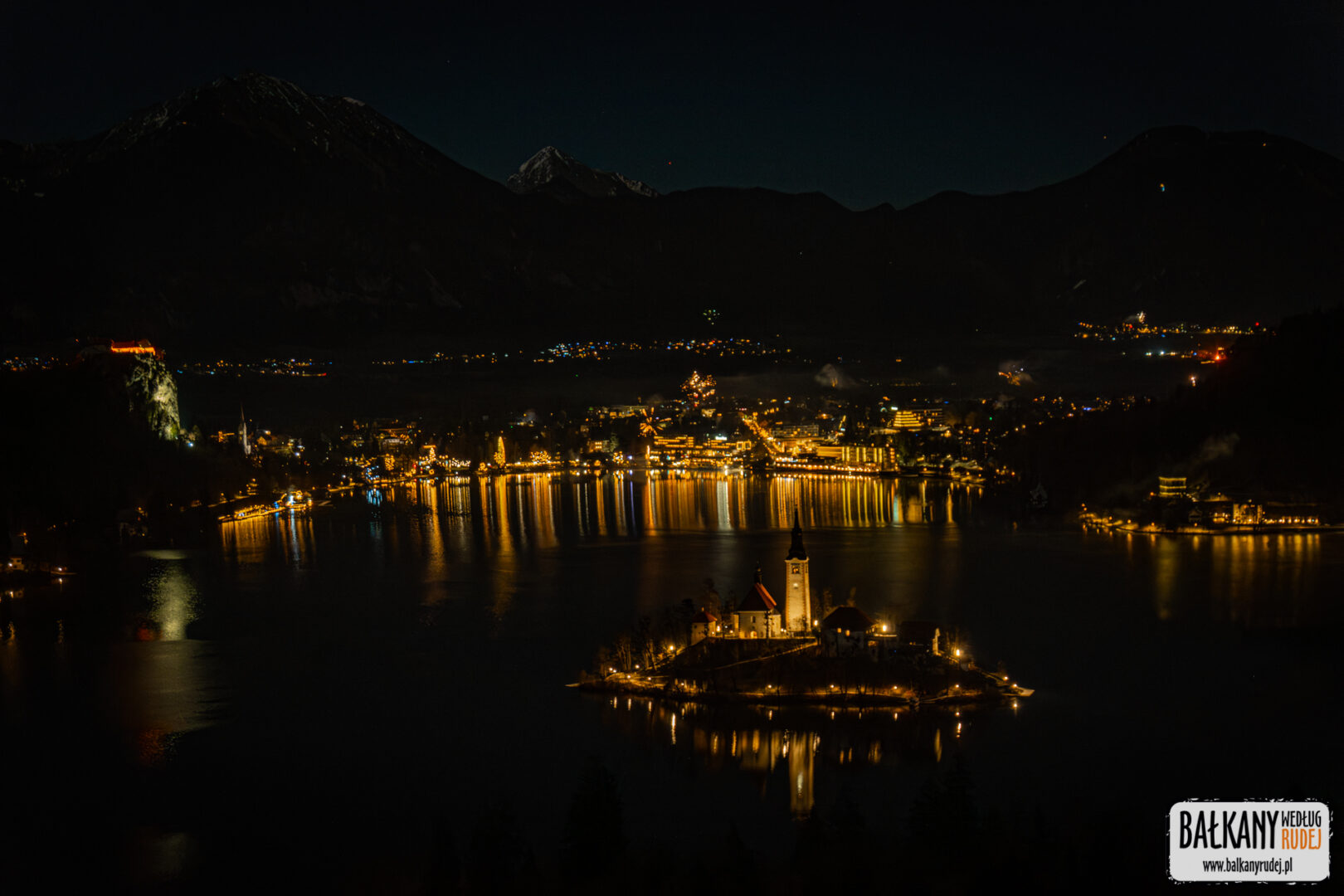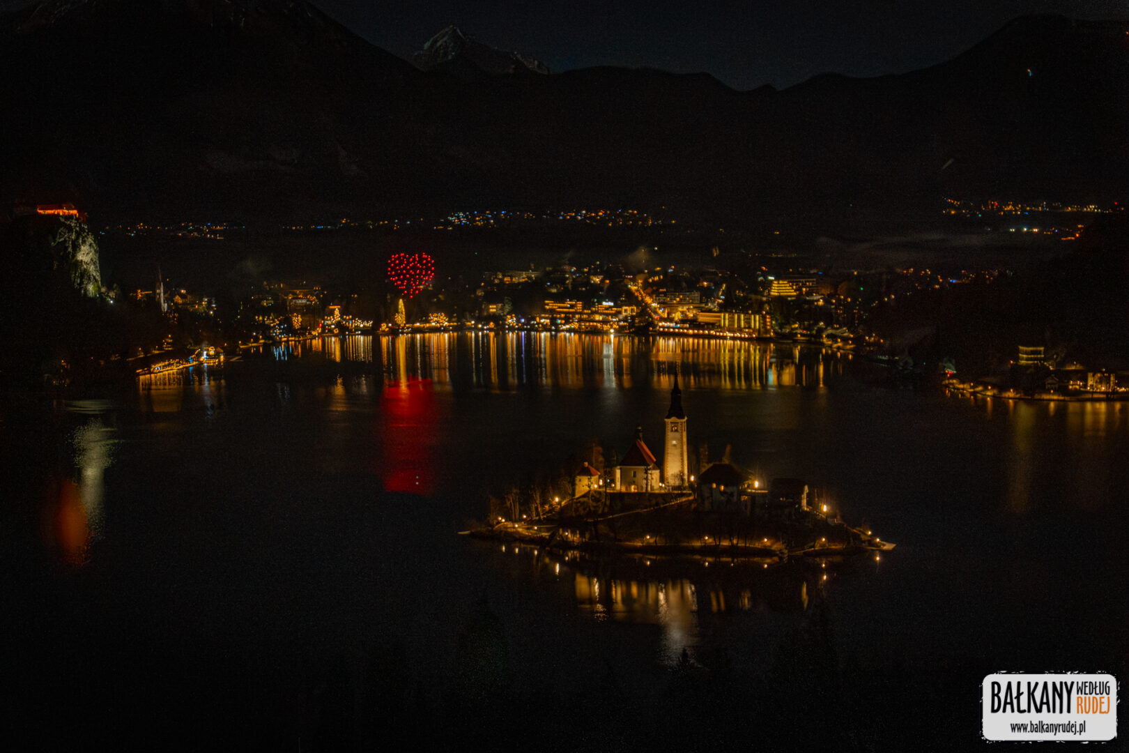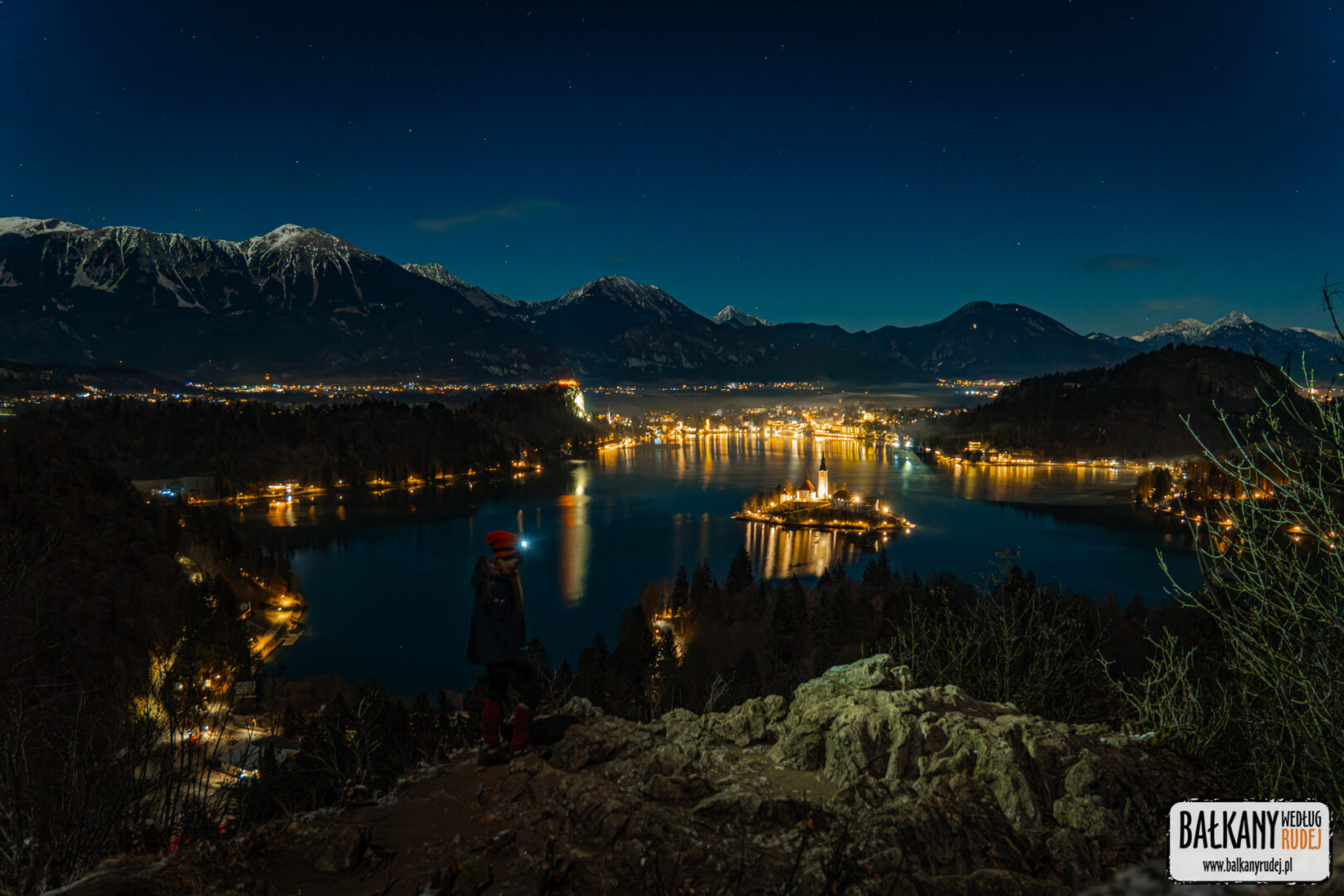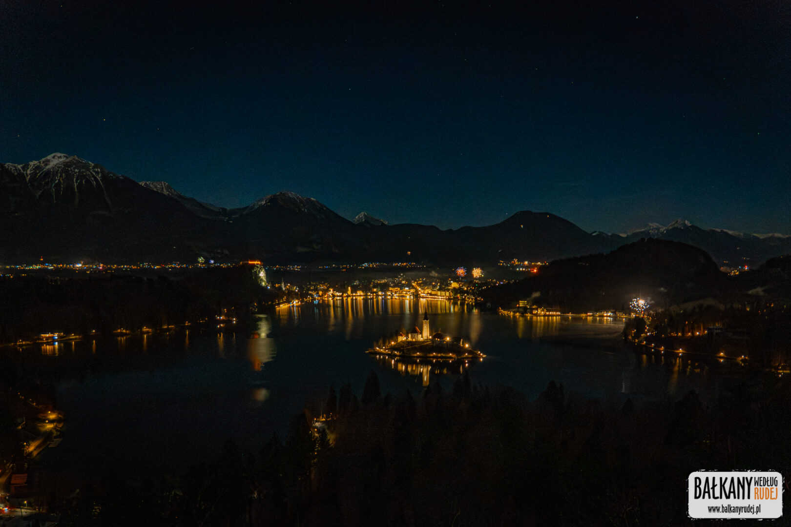 Kiedy w końcu zadecydowaliśmy o tym, że sylwester w Słowenii to dobry pomysł, od razu wpadł nam do głów pomysł, żeby nowy rok powitać na… Ojstricy. To skaliste wzniesienie ponad Bledem jest chyba jednym z najbardziej znanych punktów widokowych nie tylko w tej okolicy, ale i całym kraju. Mieliśmy pewne obawy, że na podobny pomysł wpadnie więcej osób. Ostatecznie jednak uznaliśmy, że warto zaryzykować. Dlatego ok. 23 wyruszyliśmy autem z Jesenic do Bledu. Zaparkowaliśmy niedaleko stacji kolejowej, skąd na piechotę udaliśmy się ku zachodniemu krańcowi jeziora, bo to właśnie ponad nim wznosi się Ojstrica. Od razu zauważyliśmy, że ktoś już na niej był, a dwie inne osoby maszerowały z czołówkami przez las. Tego wieczora na szczęście nie było dużego mrozu. Za to widoczność była doskonała – widać też było ośnieżone szczyty pasma Karawanków. Po 20 min znaleźliśmy się na Ojstricy. Oprócz nas dotarło tam jeszcze z 6 osób. Nie było więc mowy o tłumach. Wiedzieliśmy, że oprócz fajerwerków, nad jeziorem zaplanowany był pokaz dronów. Kiedy wybiła północ oczywiście niebo nad jeziorem rozświetliły sztuczne ognie. Sam pokaz rozpoczął się kilka minut po 24. I musimy przyznać, że nawet z oddali robił naprawdę przyjemne wrażenie. Drony układały się w symbole związane z tym zakątkiem Słowenii. Pojawił się więc m.in. łabędź, tradycyjna łódź, zamek czy Triglav. Oczywiście docierały też do nas dźwięki koncertu, jaki odbywał się nad brzegiem jeziora, tuż obok odwiedzonego przez nas dzień wcześniej jarmarku. Przed godz. 1 opuściliśmy Ojstricę niesamowicie zadowoleni, że to właśnie na niej postanowiliśmy spędzić tę noc.