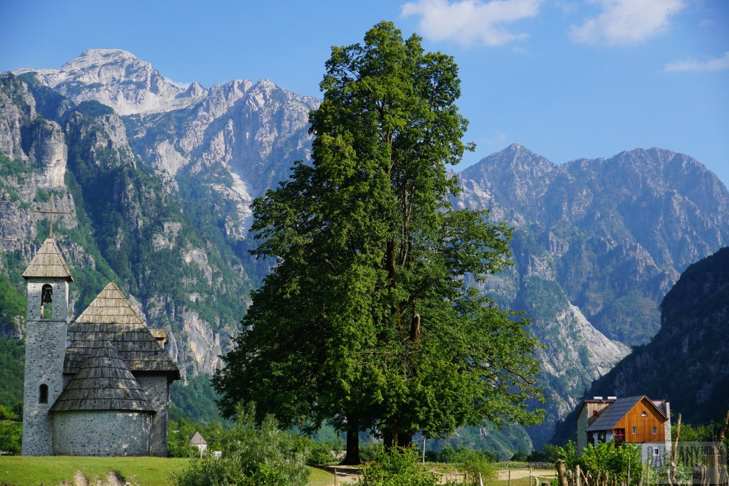 Wysiadamy w Theth. Po kilku sekundach orientuję się, że zostawiłam w busie czapkę z daszkiem. Niestety ten zdążył już odjechać spory kawałek i nawet puszczając się za nim pędem, nie byłam w stanie go dogonić. Zła na swoje gapiostwo, drepczę za Markiem w głąb wsi. O Theth słyszeliśmy wiele, zarówno opinii pozytywnych, jak i negatywnych. My dość szybko wyrabiamy sobie na jego temat własne zdanie. Jeśli planujecie się tam wybrać, aby lepiej poznać historię i kulturę górali północnoalbańskich, to raczej nie macie tu czego szukać. Wszystkie domy (a jeśli nie wszystkie, to ich 90%) zostały przerobione na hotele lub pensjonaty. Owszem, są kamienne i całkiem ładne, ale widać, że dostosowano je do przyjmowania gości z zagranicy, co wiąże się z lepszymi lub gorszymi przeróbkami. Jedyny, ważny zabytek, czyli kulla – kamienna wieża odosobnień, jest trochę osamotniona w krzewieniu kultury tego regionu. Notabene przy niej znajduje się darmowy camping, a raczej miejsce biwakowe. Jeśli chodzi o mieszkańców Theth, to od najmłodszych po najstarszych, wszyscy nastawieni są na zarobek. Dodać należy, że w porównaniu z Valboną, ta miejscowość jest sporo droższa. Ale czy ciekawsza? Śmiemy wątpić. No dobrze, ale może widoki chociaż są ładne? Są, ale chyba Valbona i jej okolice pod tym kątem zrobiły na nas większe wrażenie. Niestety dla nas Theth to spore rozczarowanie, w szczególności, że próbowaliśmy się do niego dostać trzy razy i dopiero za czwartym udało nam się do niego dojechać. Po tylu latach odwiedzania Bałkanów i samej Albanii, nasze wymagania co do miejsc naprawdę wzrosły i efekt „wow” nie tak łatwo u nas wywołać. Tu go zabrakło.