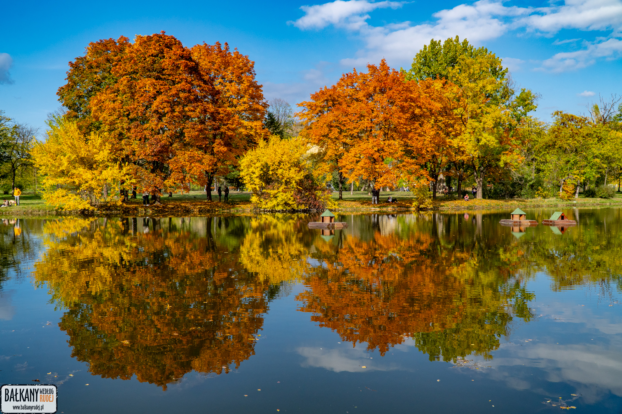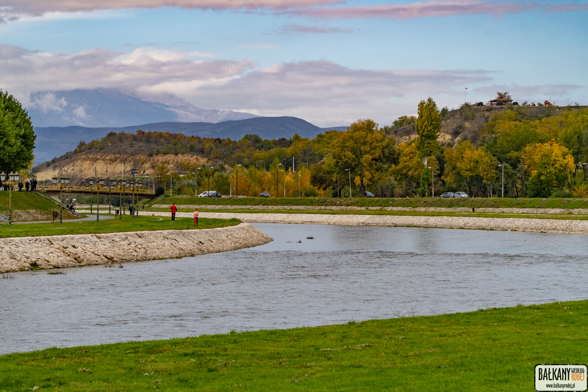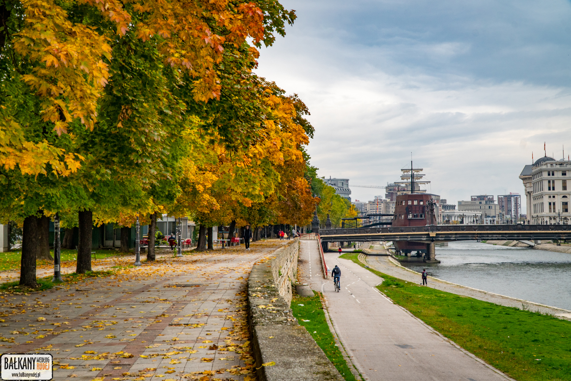 Trzeciego dnia naszego pobytu w Skopje pogoda była wprost wymarzona. Ciepło, słońce i niebieskie niebo. Ponieważ rano było jeszcze odrobinę pochmurno, zdecydowałyśmy się odwiedzić Muzeum Walki o Macedonię (Музејот на македонската борба). Ja miałam okazję zwiedzić go kilka lat wcześniej, ale chętnie tam wróciłam. Ta niezwykła placówka przybliża dążenia Macedończyków do niepodległości. Spacerując po muzealnych salach spotyka się lokalnych bohaterów narodowych zaprezentowanych w formie realistycznych figur woskowych oraz ogromnych obrazów. Po pobycie w muzeum obrałyśmy ścieżkę pieszo-rowerową wzdłuż Wardaru. Tym razem udałyśmy się na zachód. Najpierw maszerowałyśmy u podnóża wzgórza z twierdzą. Na wysokości Acibadem Sistina przechodzimy mostem pieszym na prawy brzeg rzeki i kierujemy się w stronę parku miejskiego. Późniejszą jesienią warto tam wpaść. Głównie po to, by podziwiać cudowne, jesienne kolory drzew, które przeglądają się w parkowych jeziorkach i kanałkach. W niedzielne popołudnie było tam mnóstwo spacerowiczów. Na szczęście teren parku jest na tyle duży, że absolutnie te tłumy nie przeszkadzały. Przed zachodem słońca wracamy na wzgórze z twierdzą. Najpierw wspinamy się w okolice Muzeum Sztuki Współczesnej, później schodzimy na mury warowni. Oba miejsca są najlepszymi punktami na podziwianie zachodu słońca. Zresztą, spójrzcie na zdjęcia poniżej, a sami się przekonacie.