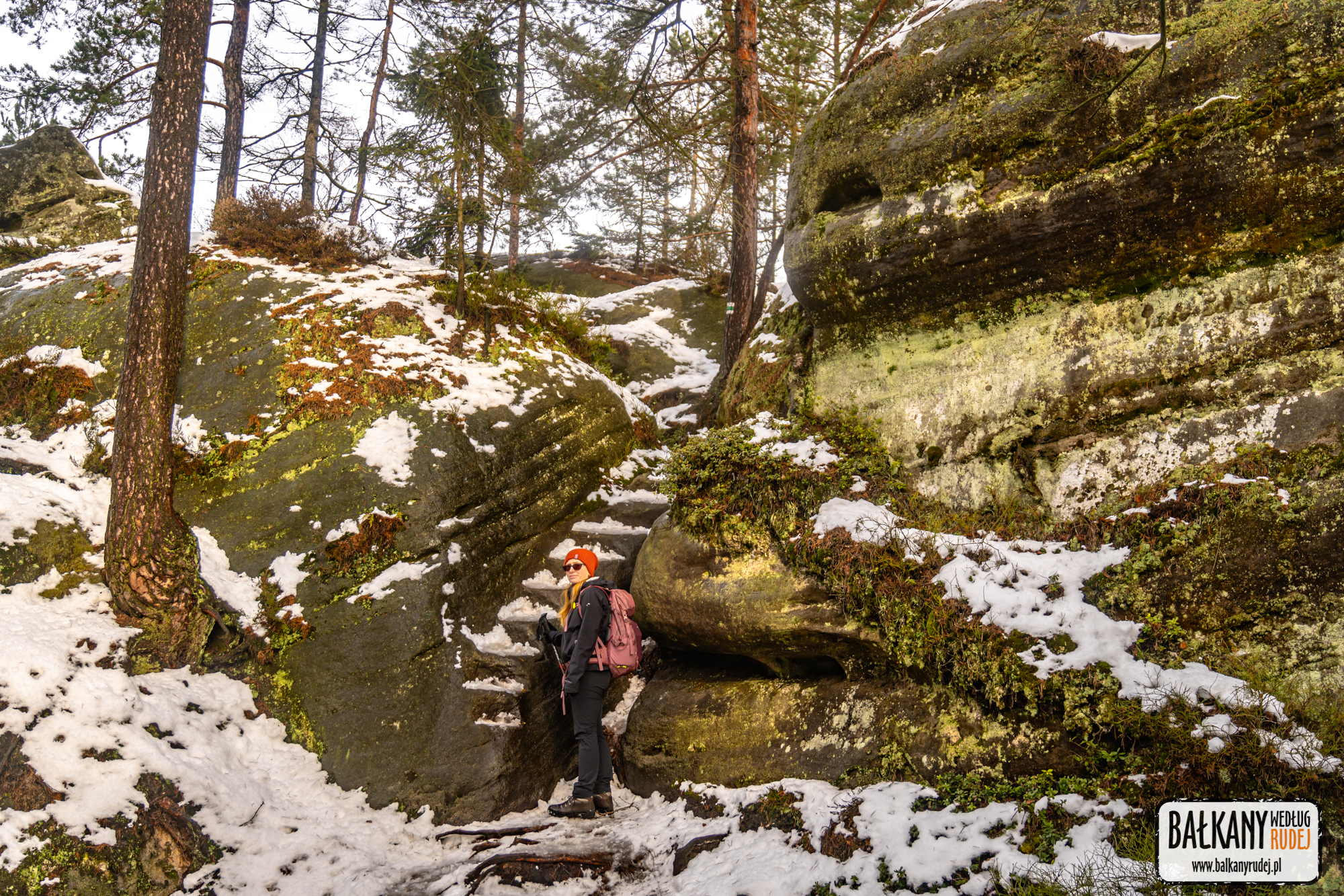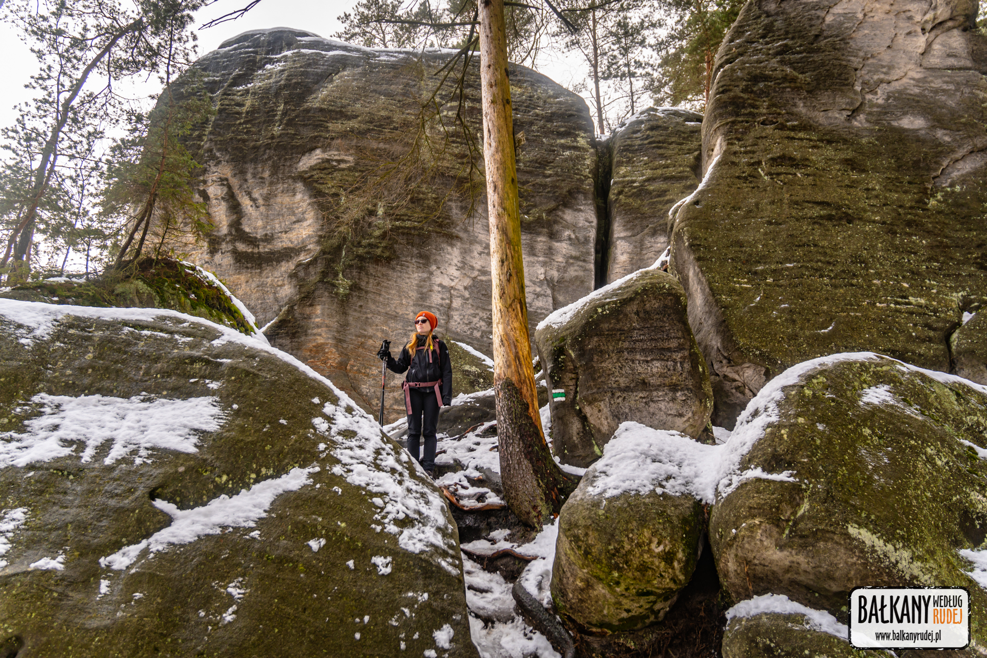 Z Kudowej-Zdroju przejechaliśmy do małej miejscowości, jaką jest Machovska Lhota. Tam zostawiliśmy auto na sporym parkingu, na którym znajdują się wiatki, mapy okolicy czy toalety. Stamtąd odchodzi kilka szlaków. My ruszyliśmy za czerwonymi i niebieskimi oznaczeniami, które prowadzą wzdłuż wąskiej, asfaltowej drogi. Nią dotarliśmy do punktu o nazwie U Zabitého. Na skrzyżowaniu skręciliśmy w lewo, w żółty szlak, który dość szybko zaprowadził nas ku pierwszym formacjom skalnym. Im dalej szliśmy, tym teren robił się coraz bardziej urozmaicony. W pewnym momencie żółty szlak meandruje pośród skalnego labiryntu, który pokryty śniegiem tworzy iści bajkową scenerię. Kulminacyjnym etapem tej części trekkingu było wejście na punkt widokowy, czyli Junácką vyhlídkę. Stamtąd udało nam się nawet złapać trochę widoków, w tym na Szczeliniec i okolice Pasterki. Co ciekawe, niemal przez cały czas, gdy pokonywaliśmy ten fragment naszej trasy, byliśmy sami.