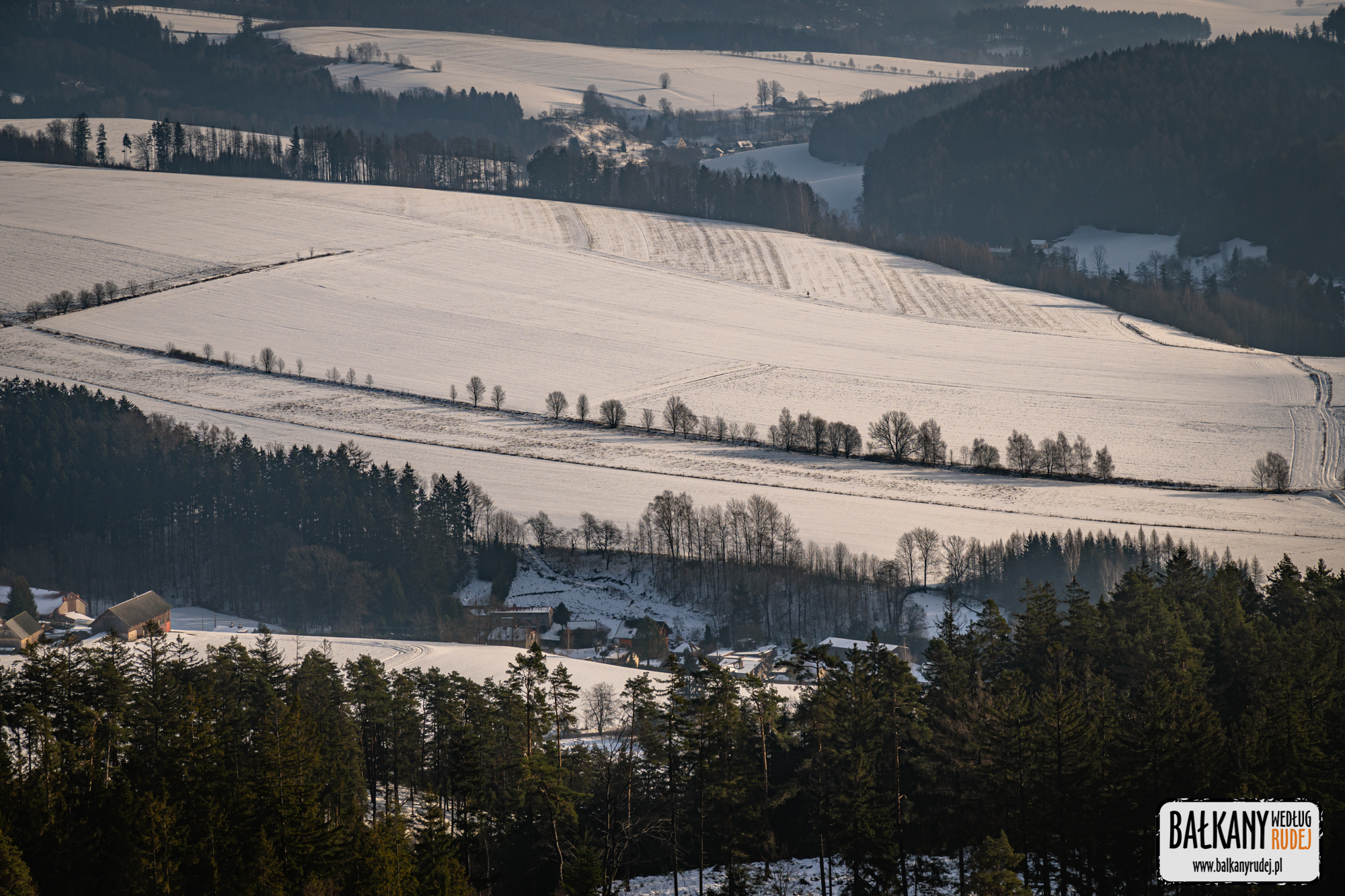 Z Koruny zeszliśmy żółtym szlakiem do leśnej drogi, która trawersuje u podnóża Bożanowskiego Szpiczaka. Spotkaliśmy tu tylko parę narciarzy biegowych, a poza tym mogliśmy wędrować w ciszy i spokoju. Dalej, niebieskim szlakiem zeszliśmy do skrzyżowania U Zabitého. Żeby jednak nie wracać asfaltową drogą, postanowiliśmy przejść żółtym szlakiem do Machovskiej Lhoty. Szlak poprowadzony jest tutaj głównie przez rozległe polany, pozwalając podziwiać panoramę wsi i okolicznych wzgórz. Po pokonaniu 17 km znów byliśmy przy aucie.